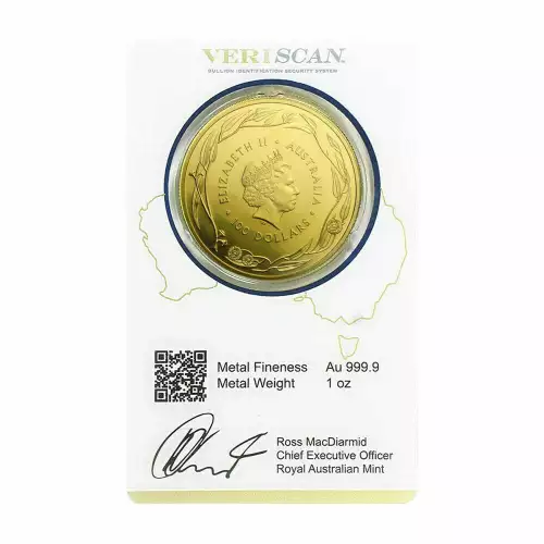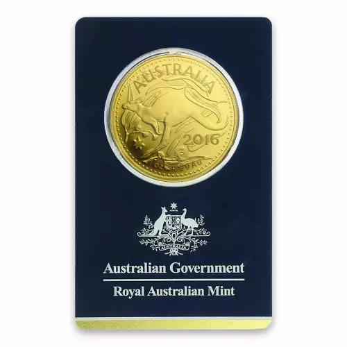 The 2016 Royal Australian Mint 1 oz Kangaroo is made from 0.9999 fine gold with a weight of 1 troy oz and bears a face value of 100 AUD.