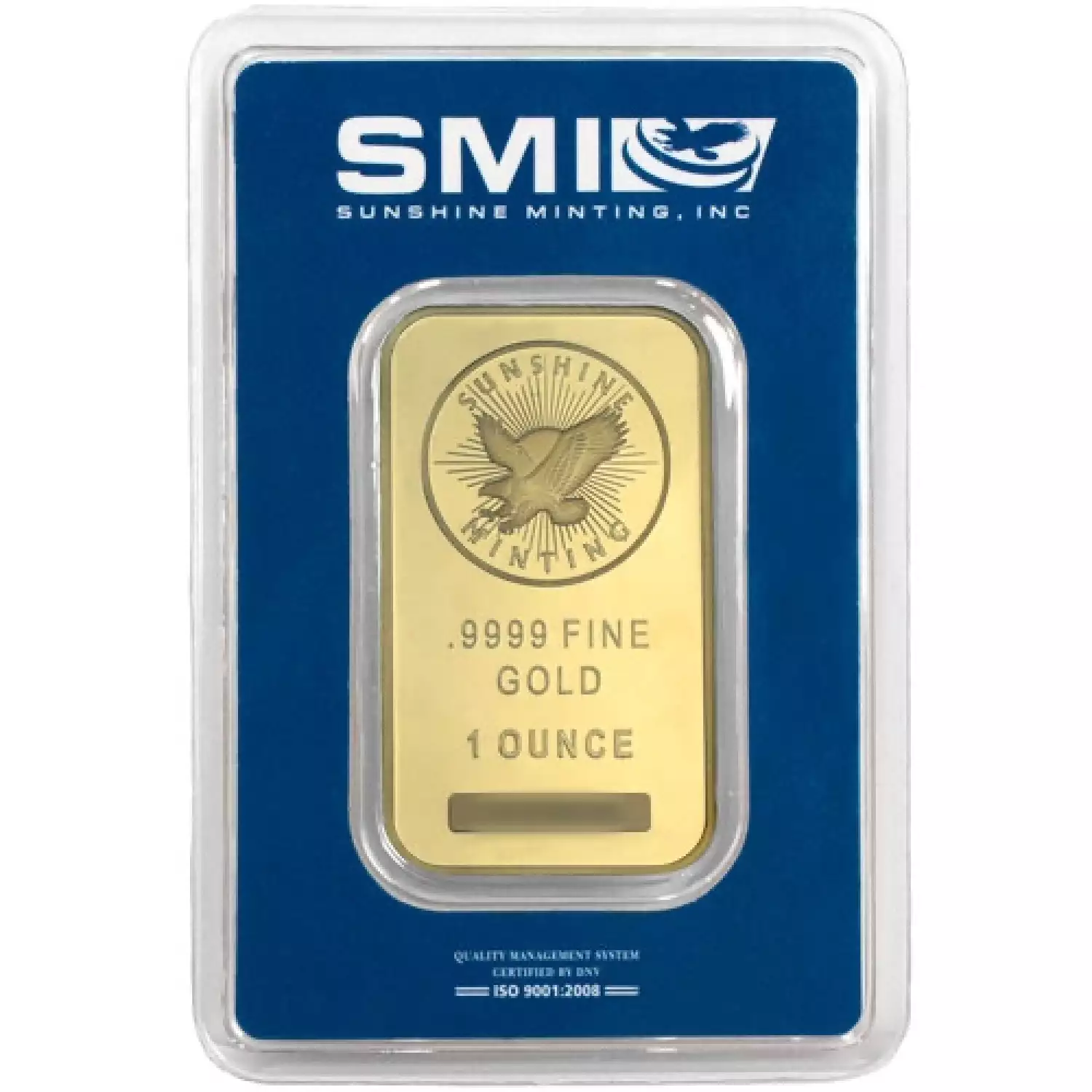 Each 1 oz Sunshine Minting Gold Bar contains 1 troy ounce of .9999 fine gold.