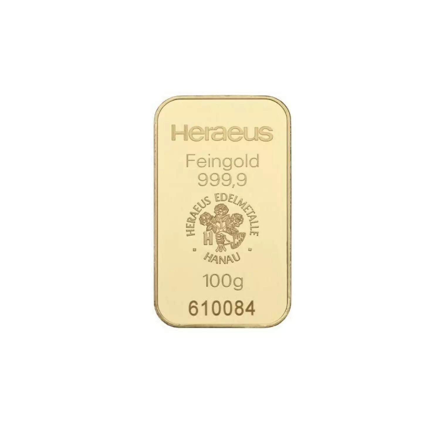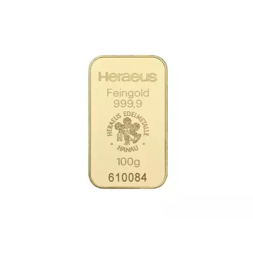 Each 100g Heraeus Minted Gold Bar contains 100 grams of fine 24 carat gold with a purity level of .9999.