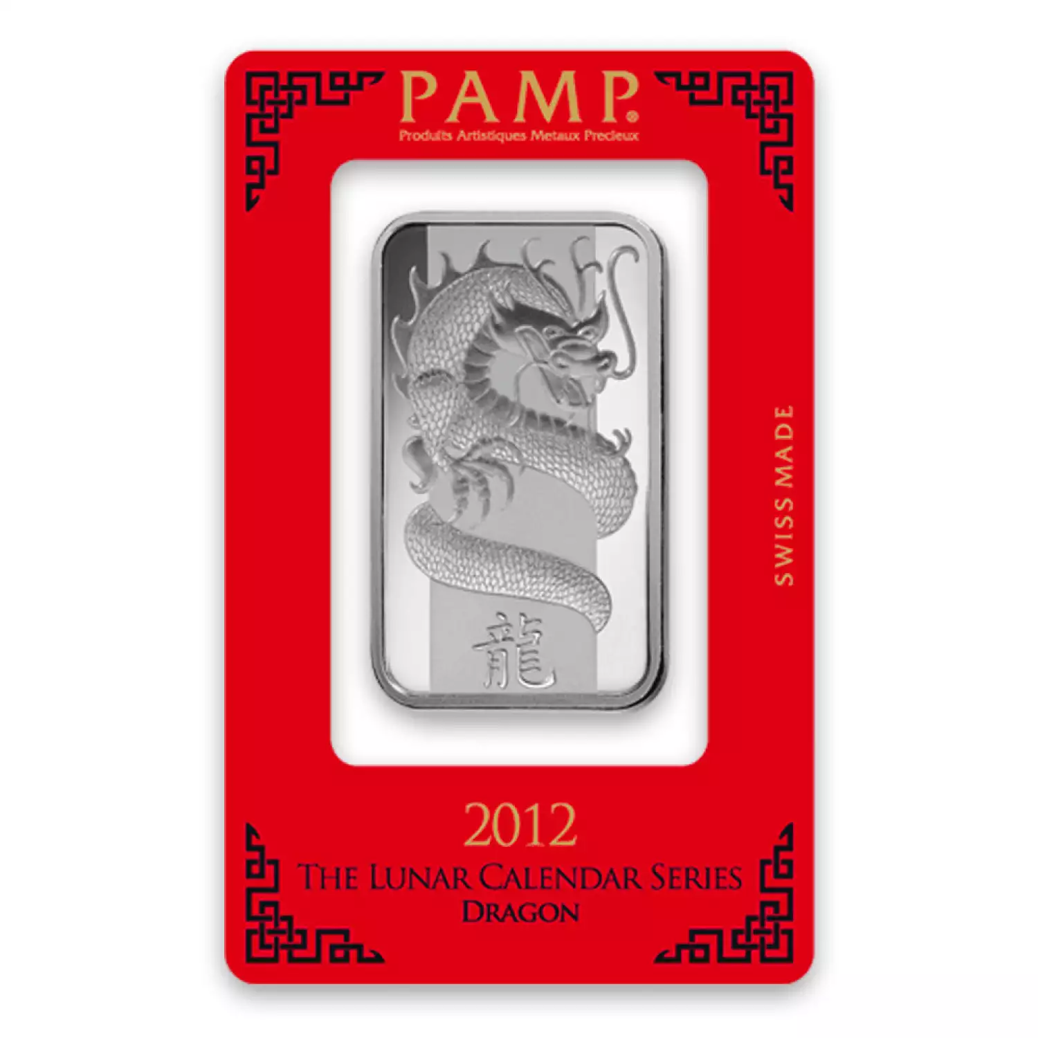 The 1oz PAMP Silver Bar - Lunar Dragon is manufactured in Switzerland and is composed of 1 troy ounce of .999 pure silver. This beautiful silver bar features a dragon design for the Chinese Zodiac series on the obverse.