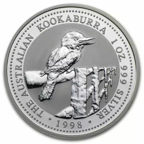 The 1998 1oz Australian Perth Mint Silver Kookaburra is composed of 1 troy ounce of 0.999 fine silver and has a mintage of 103,119 coins.