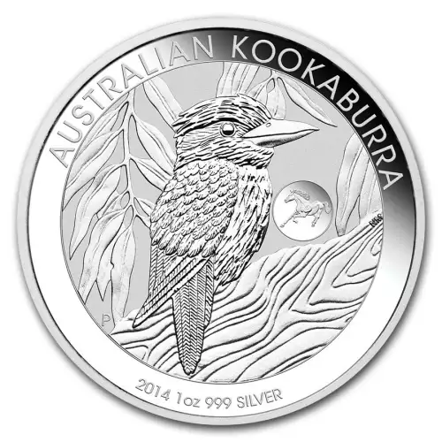 Each 2014 1oz Australian Perth Mint Silver Kookaburra - Horse Privy Mark contains 1 troy ounce of .999 fine Silver. These beautiful silver coins are highly popular among investors and collectors. The reverse of the coin features a kookaburra sitting on a tree branch surrounded by leaves.
