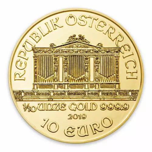 The 2019 1/10 oz Austrian Gold Philharmonic is a classically styled .9999 fine gold coin, backed by Austria. This series of gold coin is highly popular among investors and collectors. The 1/10 oz Austrian Gold Philharmonic coin contains 0.1 oz of gold. The Reverse of the 2019 1/10 oz Austrian gold coin features the stunning image of the Great Organ of the Golden Hall, Vienna Musikverein.
