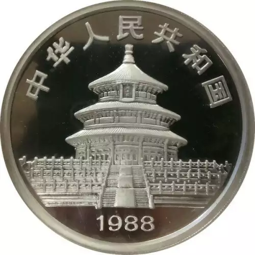 The Chinese Silver Panda Coins are one of the diverse, most popular silver bullion coins in the world. Silver Pandas have been produced since 1983, and have been minted in different denominations of 1/20 oz, 1/10 oz, 1/4 oz, 1/2 oz, and 1 oz. The 1988 5 oz Chinese Silver Panda is composed of 5 troy ounces of .999 fine silver and has a face value of 50 Yuan. The Reverse of the coin features two playful pandas in a tree.