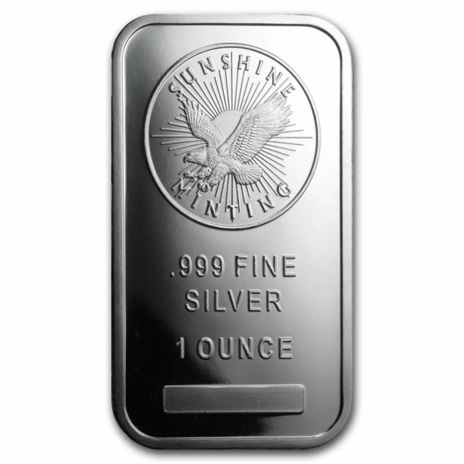 Minted by Sunshine Minting in Idaho, each 1 oz Sunshine Mint Silver Bar is composed of 1 troy ounce of .999 fine silver. This stunning small-sized silver bar features Sunshine Minting's eagle with the sun and rays in the background, stamped with the purity and weight on the obverse. The reverse of the silver bar shows a repeating pattern of rising suns with the MintMark SI™ feature in the center. These silver bars are economical for investment purposes.