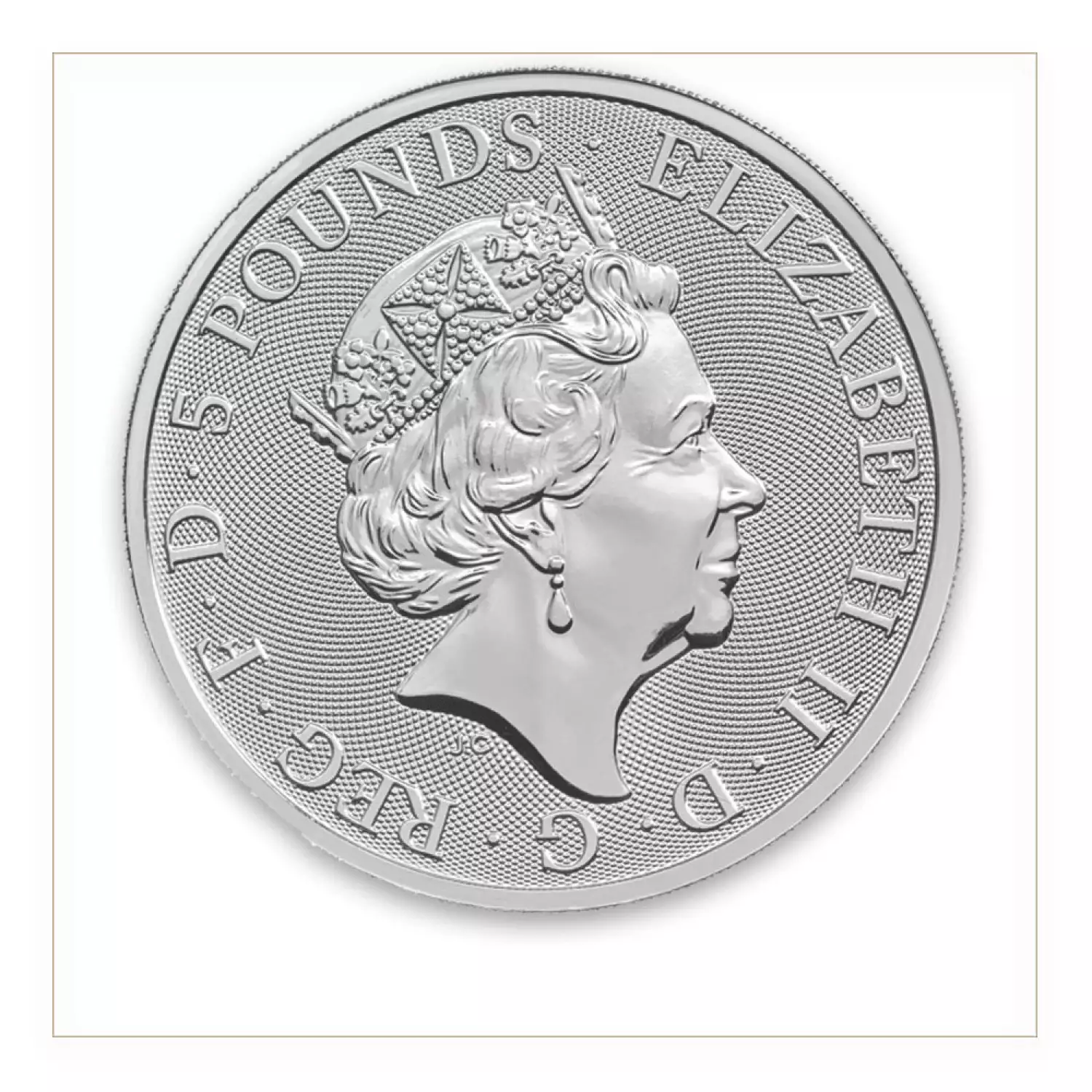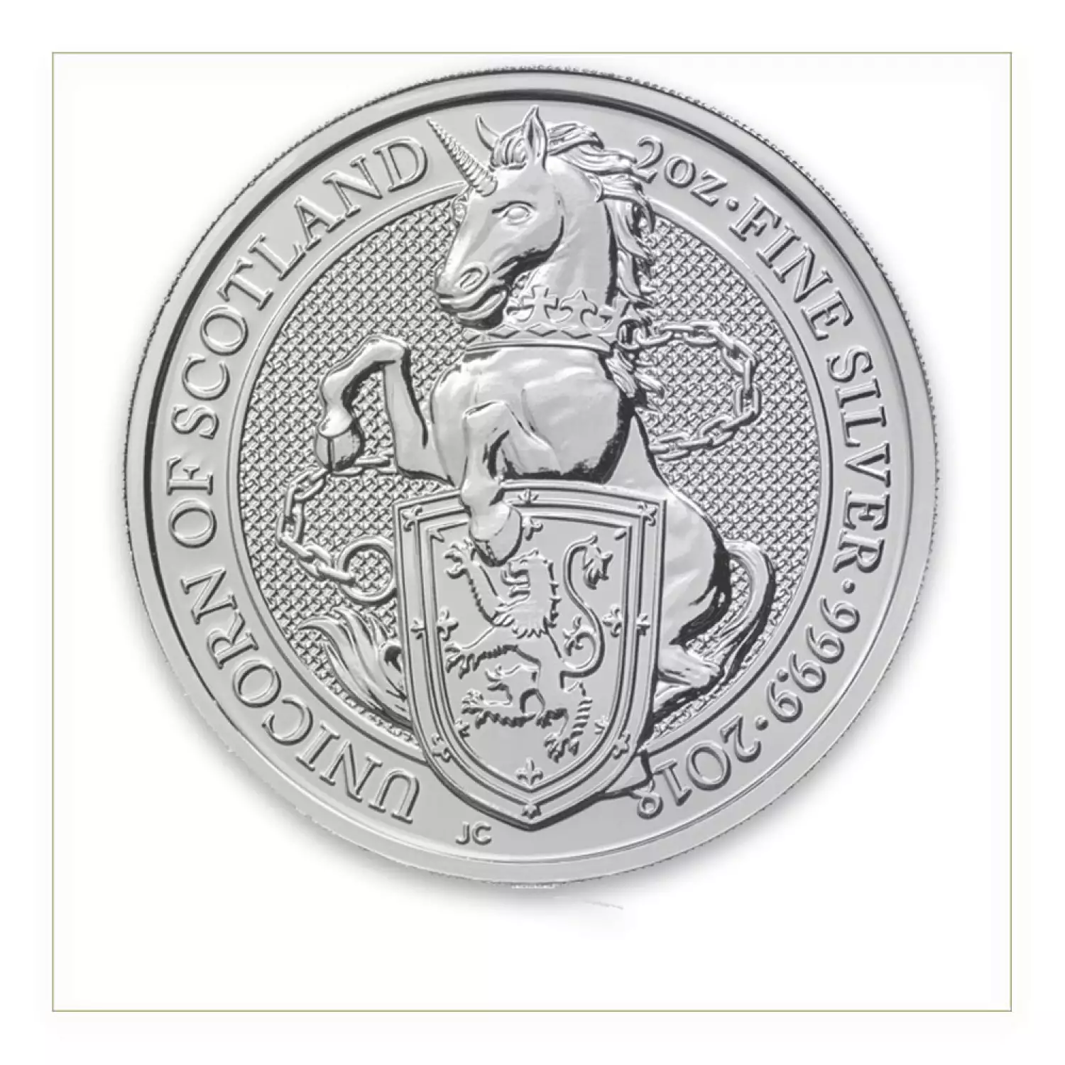 The Queen's Beasts series is UK legal tender and is produced by the Royal Mint. Each 2oz 2018 Britain Queen's Beast: The Unicorn is composed of 2 oz of .999 fine Silver. The obverse of the coin features the effigy of Her Majesty Queen Elizabeth II, along with the face value of 5 pounds.