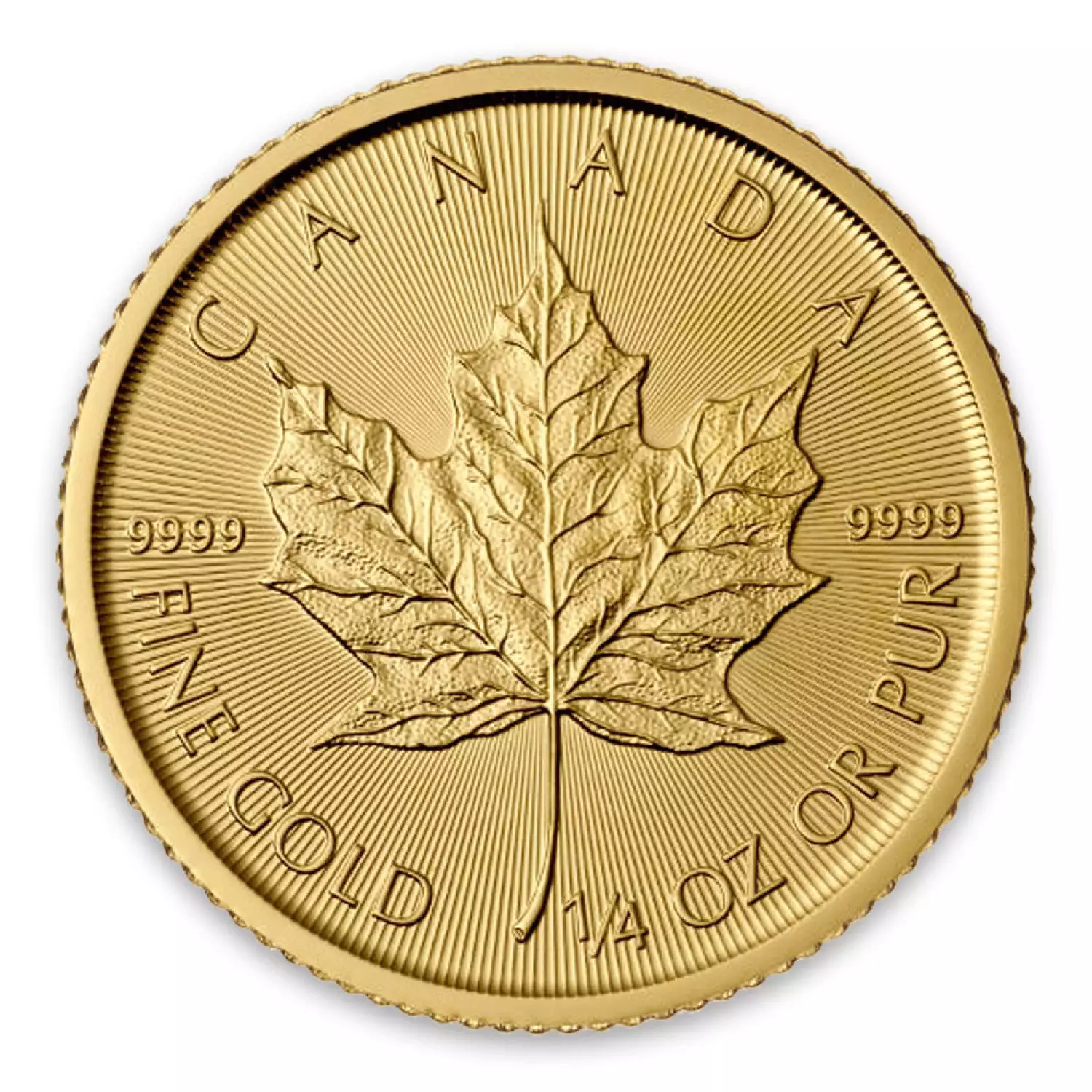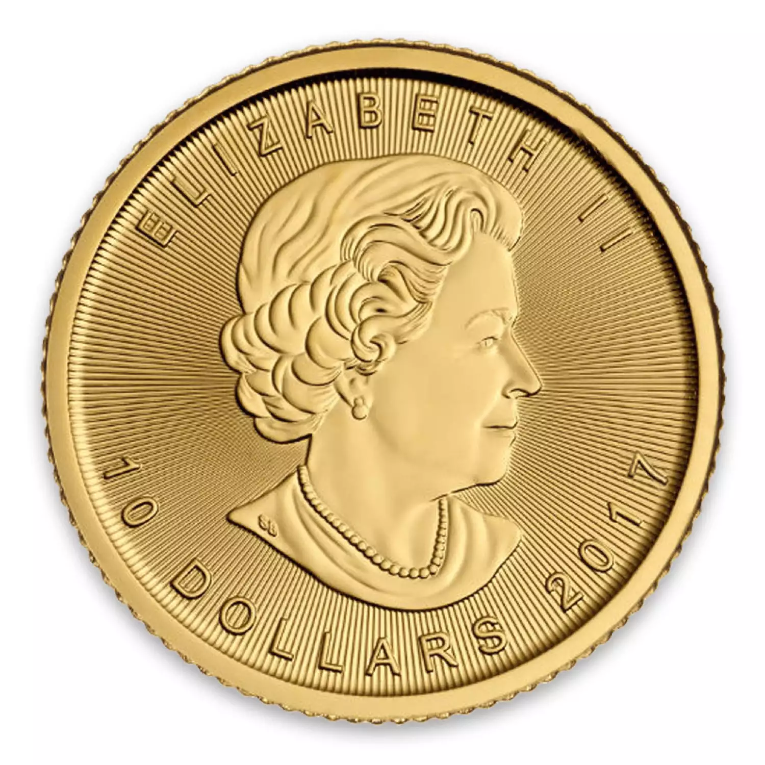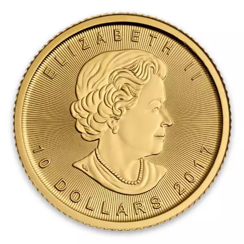 The 1/10 oz Canadian Maple Leaf gold coin contains 1/10 oz of .9999 fine Gold. These coins are minted by the Royal Canadian Mint in 1979 for the first time. The 1/10 oz Canadian Maple Leaf gold coins are renowned for their excellence and stunning design.