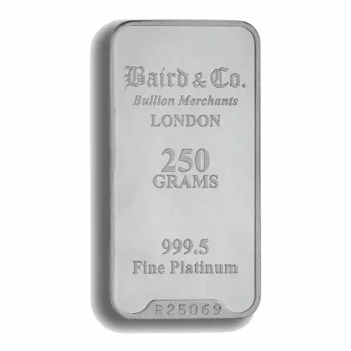 Platinum bars are available in three different types i.e. cast, minted or extruded. Manufactured by Baird Co in the UK, each 250g Baird Co Platinum Minted Bar contains 250 g of .9995 fine platinum. These stunning platinum bars appeal to both investors and collectors for their iconic designs. Platinum bars and platinum coins may tend to tarnish over time depending upon the environment they are stored.