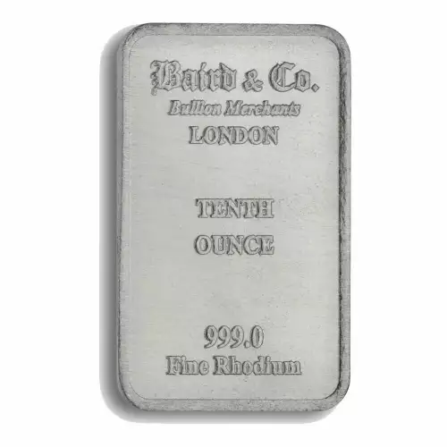 Rhodium is a rarest precious metal. The 1/10 oz Baird & Co Rhodium Minted Bars are manufactured by Baird & Co in London, England. Each bar contains 0.10 troy ounce of 999.5 fine rhodium.