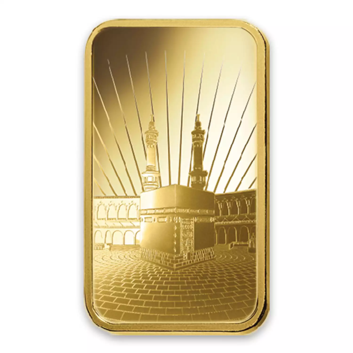 Ka `Bah. Mecca Gold Bar is one of the bars released as part of the PAMP Gold Series. The Obverse of the gold bar depicts a depiction of the Ka'bahsmall shrine in Ka'bah, Mecca. The Reverse features the PAMP Suisse logo, weight and purity along with a unique serial number.