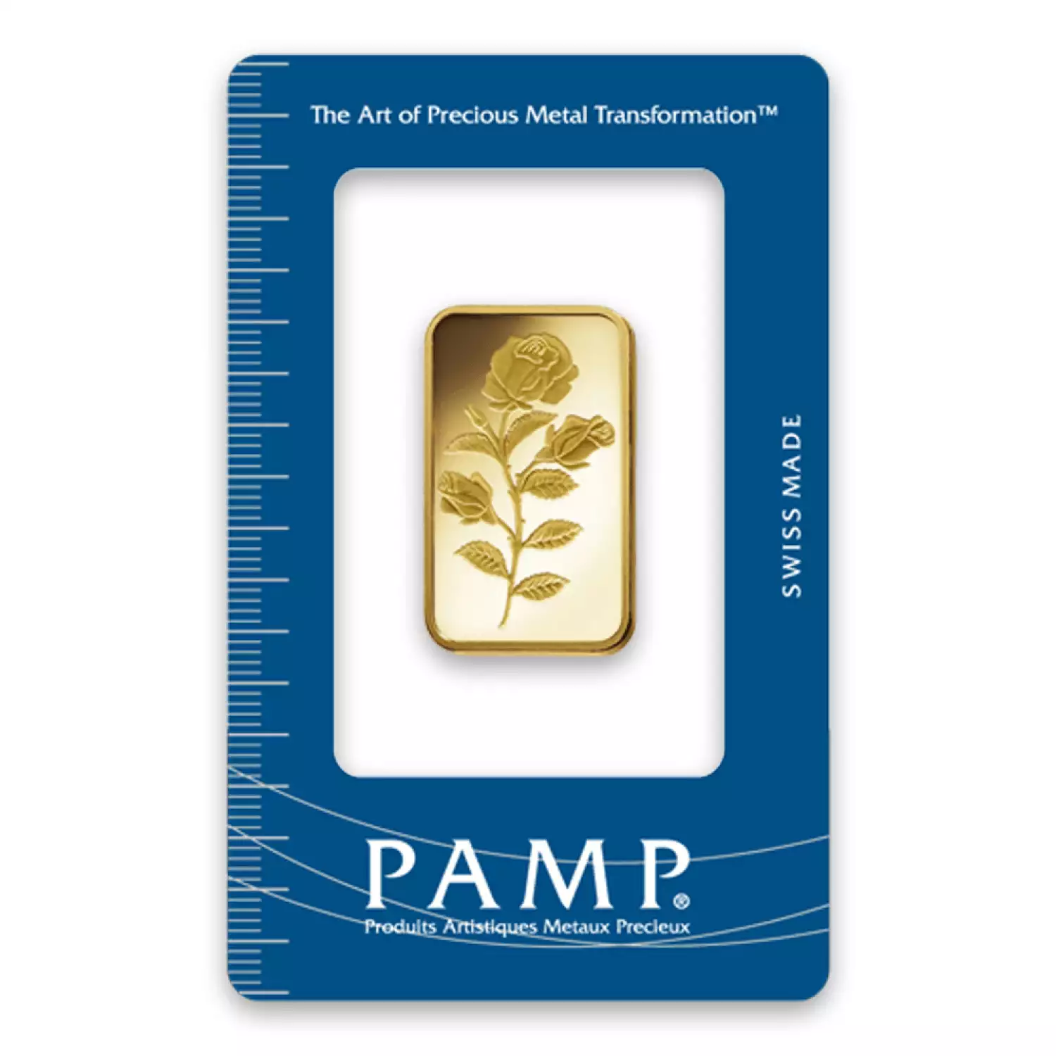 PAMP Suisse is a leading manufacturer of bullion bars that many in the precious metals industry turn to for high-quality bullion. PAMP offers gold and silver bars with varying designs and the Rosa collection is one of its most popular options. The Reverse of the gold bar depicts the weight, purity and serial number.