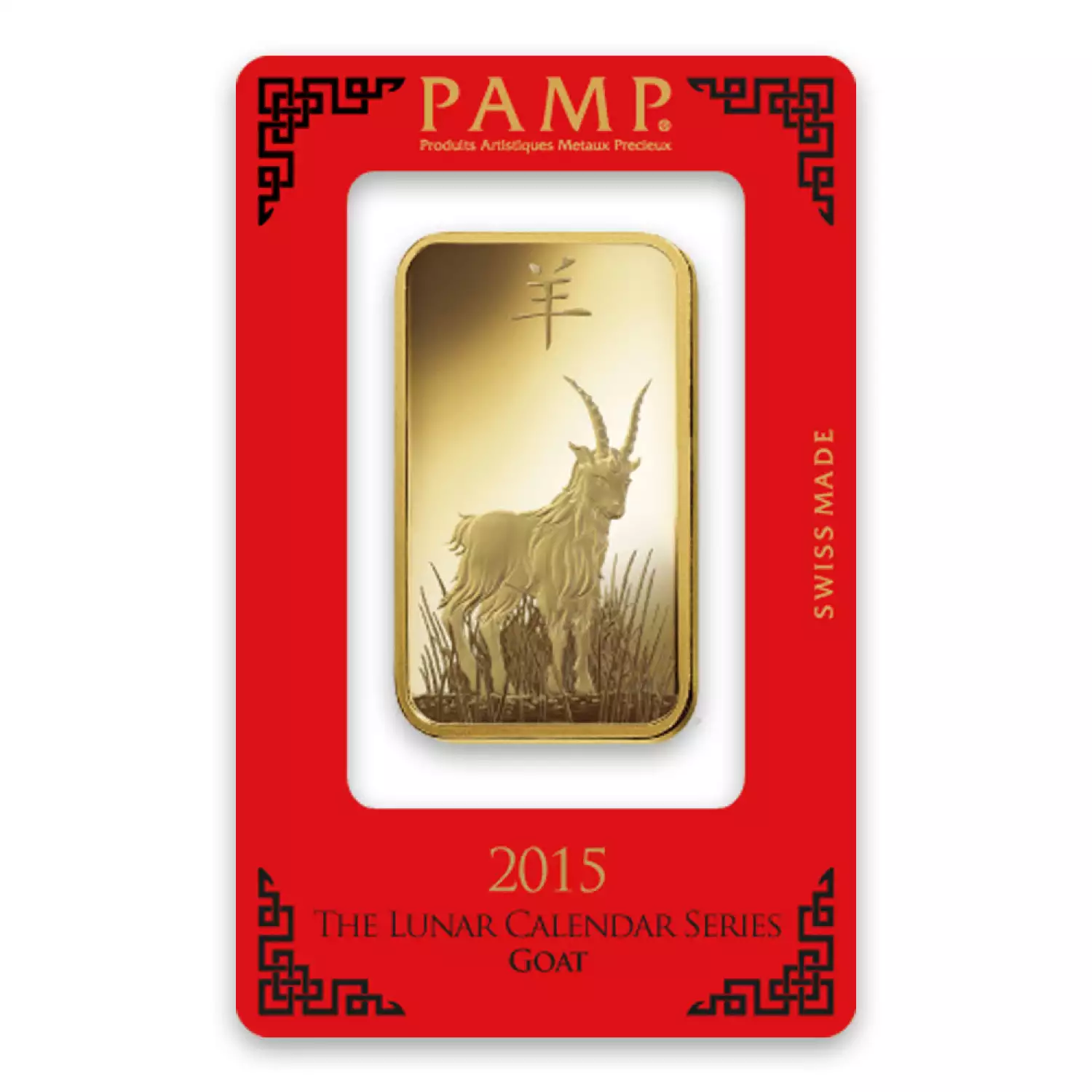 The 100g PAMP Gold Bar - Lunar Goat is manufactured in Switzerland and is composed of 100 grams of .9999 pure gold. This beautiful gold bar features a goat design for the Chinese Zodiac series on the obverse.