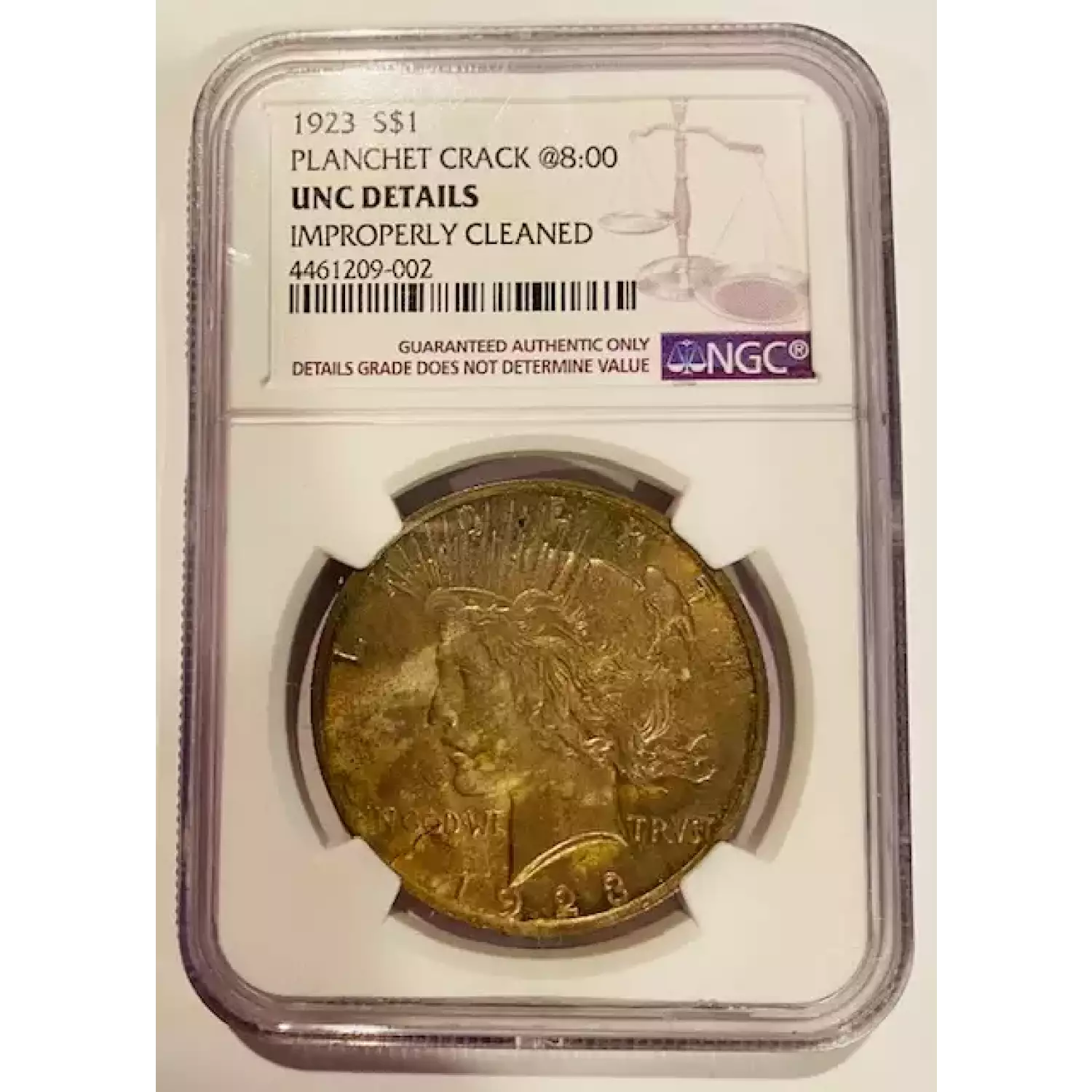 1923 Peace Dollar NGC UNC Details Planchet Crack at 8:00