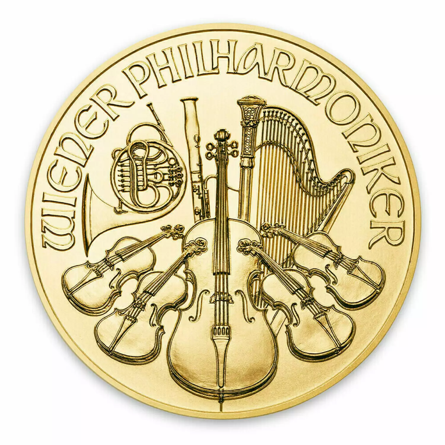 The 2020 1/25 oz Austrian Gold Philharmonic is a classically styled .9999 fine gold coin, backed by Austria. This series of gold coin is highly popular among investors and collectors. The 1/25 oz Austrian Gold Philharmonic coin contain 0.04 oz of gold. The Reverse of the 2020 1/25 oz Austrian Philharmonic gold coin features an array of instruments, including the cello, violin, harp, Vienna horn and bassoon.