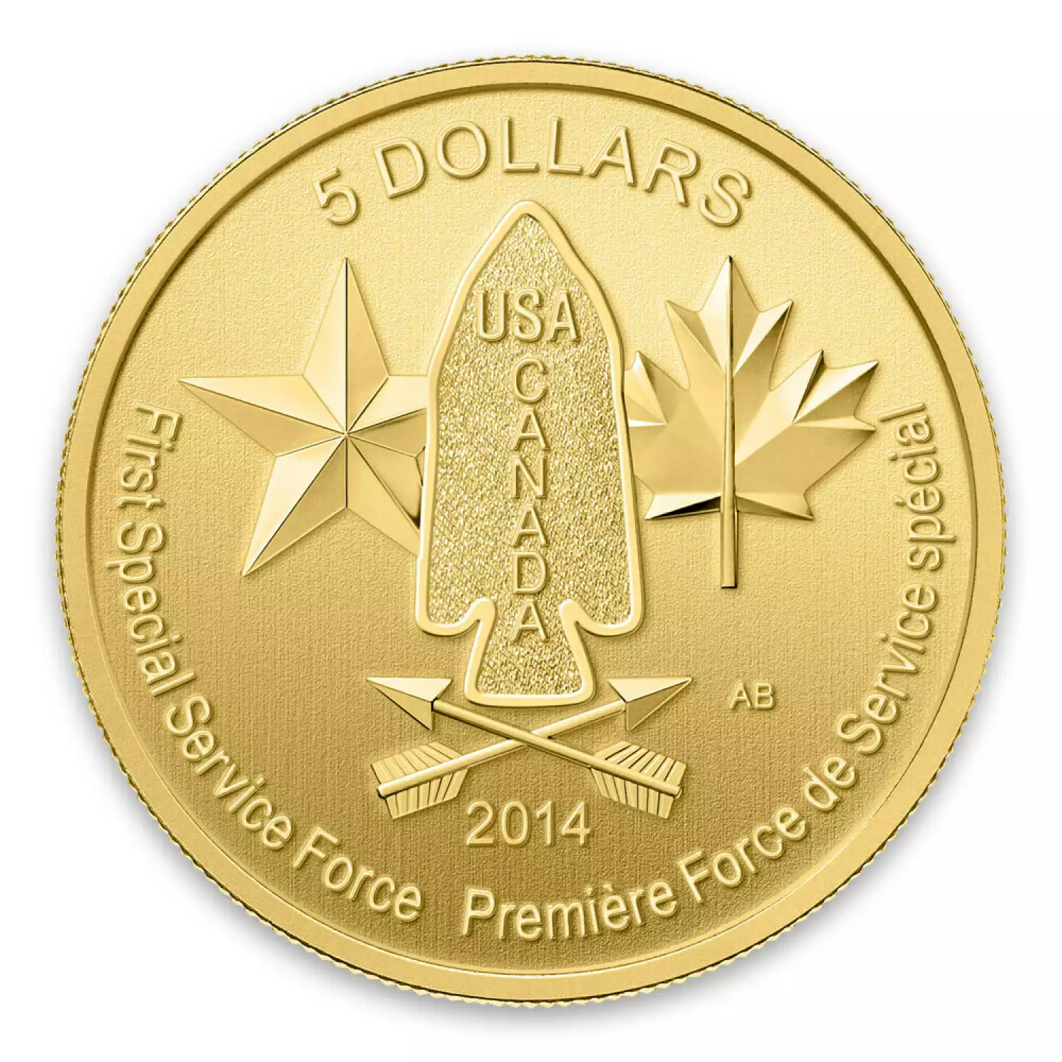 The 2014 1/10 oz Canadian Devil's Brigade Gold Coin coin contains 1/10 oz of .9999 fine Gold. These coins are a tribute for the “Devil’s Brigade,” also known as 1st Special Service Force which was an American-Canadian comando unit which fearlessly fought during World War II.