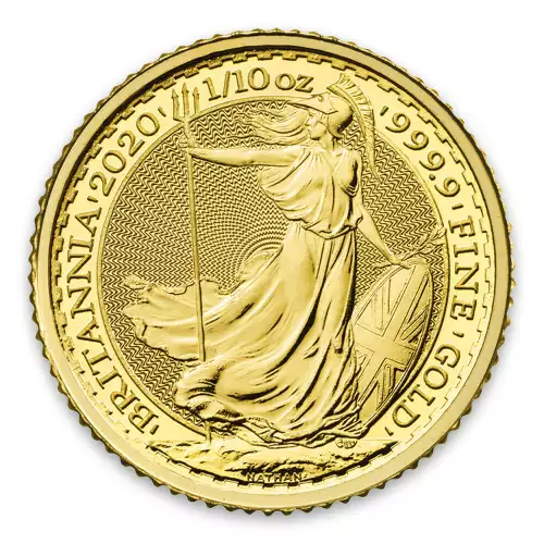 The British Gold Britannia continues to provide beauty and reliability. The 2020 1/10oz British Gold Britannia is one of the most popular investment coins in the world. Each 2020 1/10oz British Gold Britannia contains 0.1 troy ounce of .9999 fine gold. The reverse, designed by Philip Nathan has never changed since the first Britannia bullion coin in 1987. The Britannia has been a symbol through out the history and it’s first appeareance on the Roman coins is dating back over 2000 years ago.
