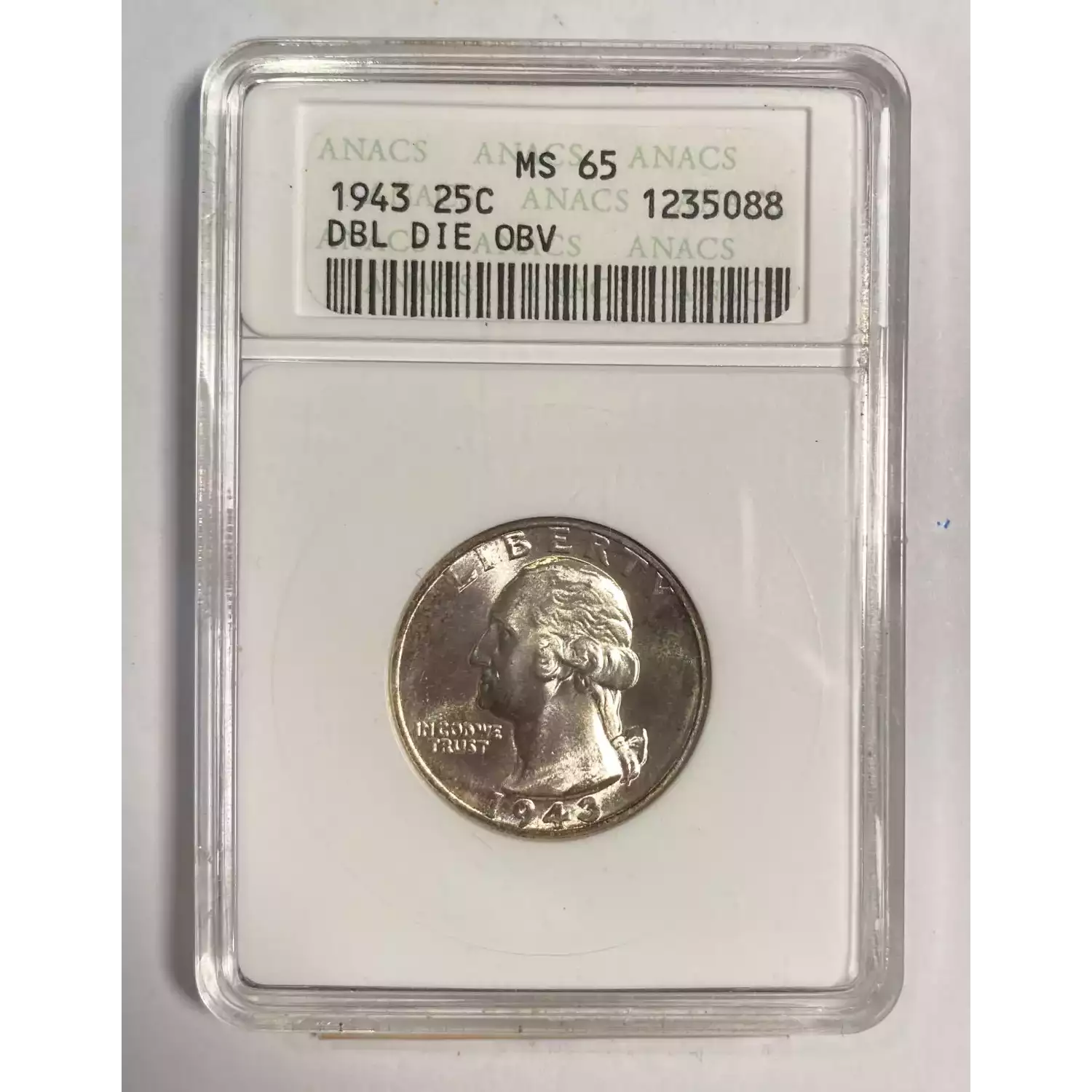 1943 Washington Quarter ANACS MS-65 DBL DIE OBV