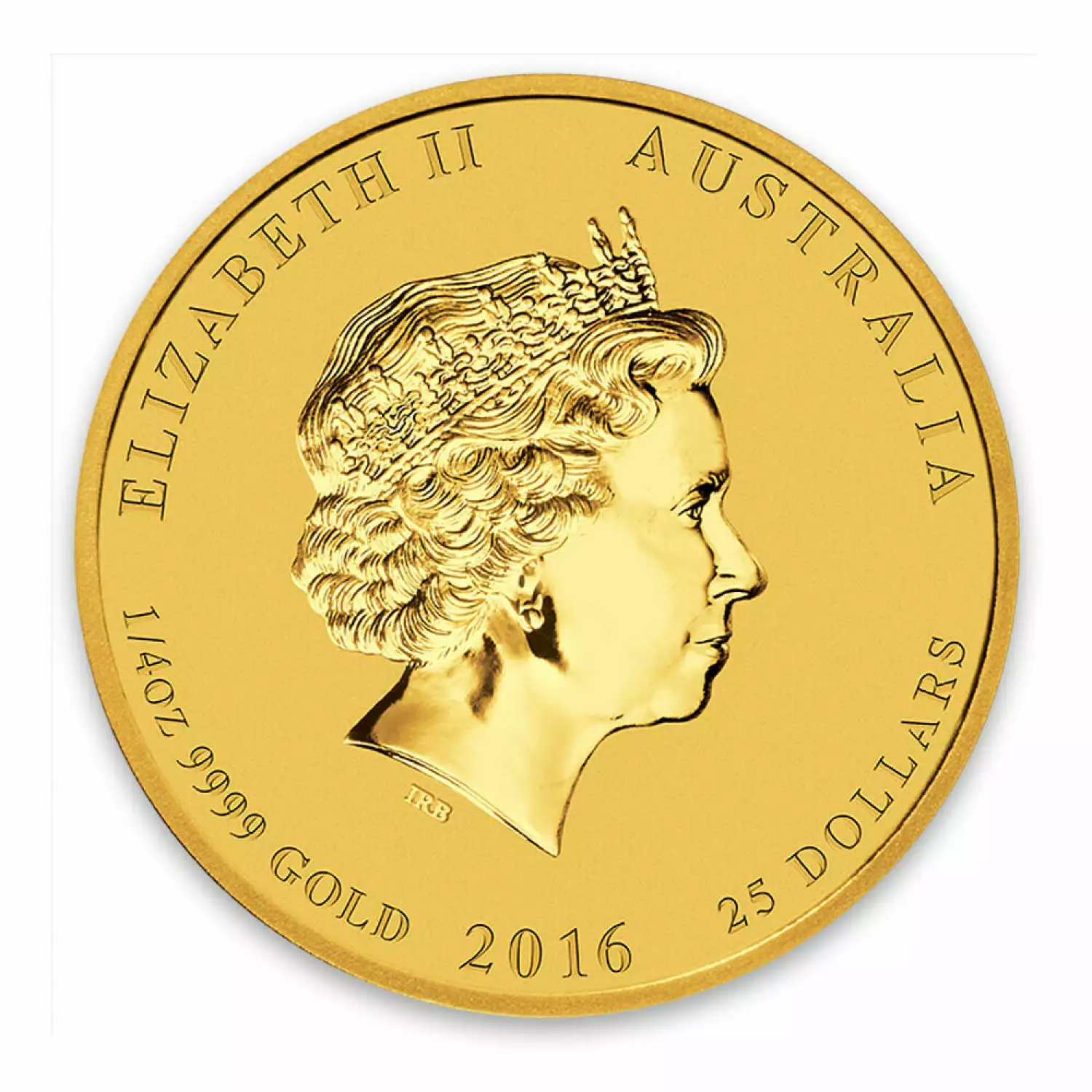 The 2016 1/4 oz Australian Perth Mint Gold Lunar II: Year of the Monkey is guaranteed by the government of Australia. The Reverse of the coin displays an adult monkey peering back over its shoulder as it sits on a peach tree. The obverse of this gold coin features a new effigy of Queen Elizabeth II.
