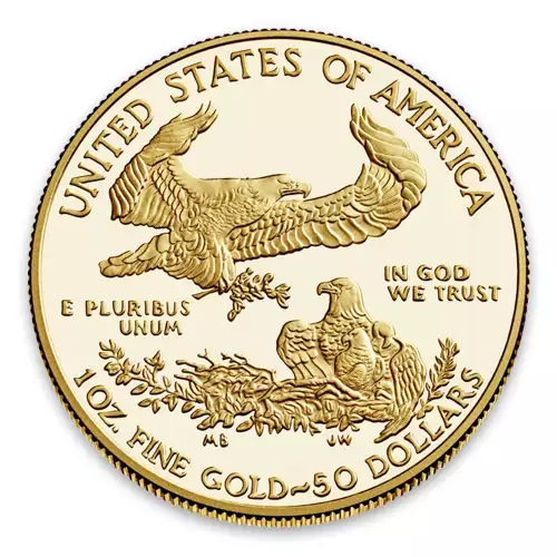 The obverse features a version of Augustus Saint-Gaudens’ full-length figure of Liberty with flowing hair, holding a torch in her right hand and an olive branch in her left. The reverse (tails) features a male eagle carrying an olive branch flying above a nest containing a female eagle and eaglets. The 22-karat gold coin is struck in West Point and bears the “W” mint mark. The coin is packaged in a burgundy velvet, satin-lined presentation case.
