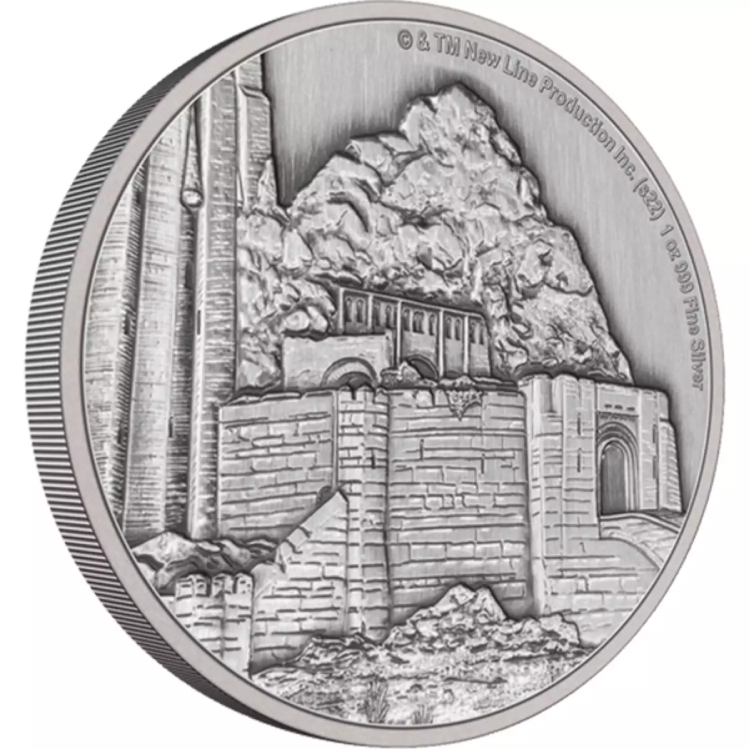 This 1oz silver coin is fully engraved and features a close-up image of the great fortress, Hornburg in Helm’s Deep, from THE LORD OF THE RINGS™. It has been antiqued and includes some relief to further accentuate the design.