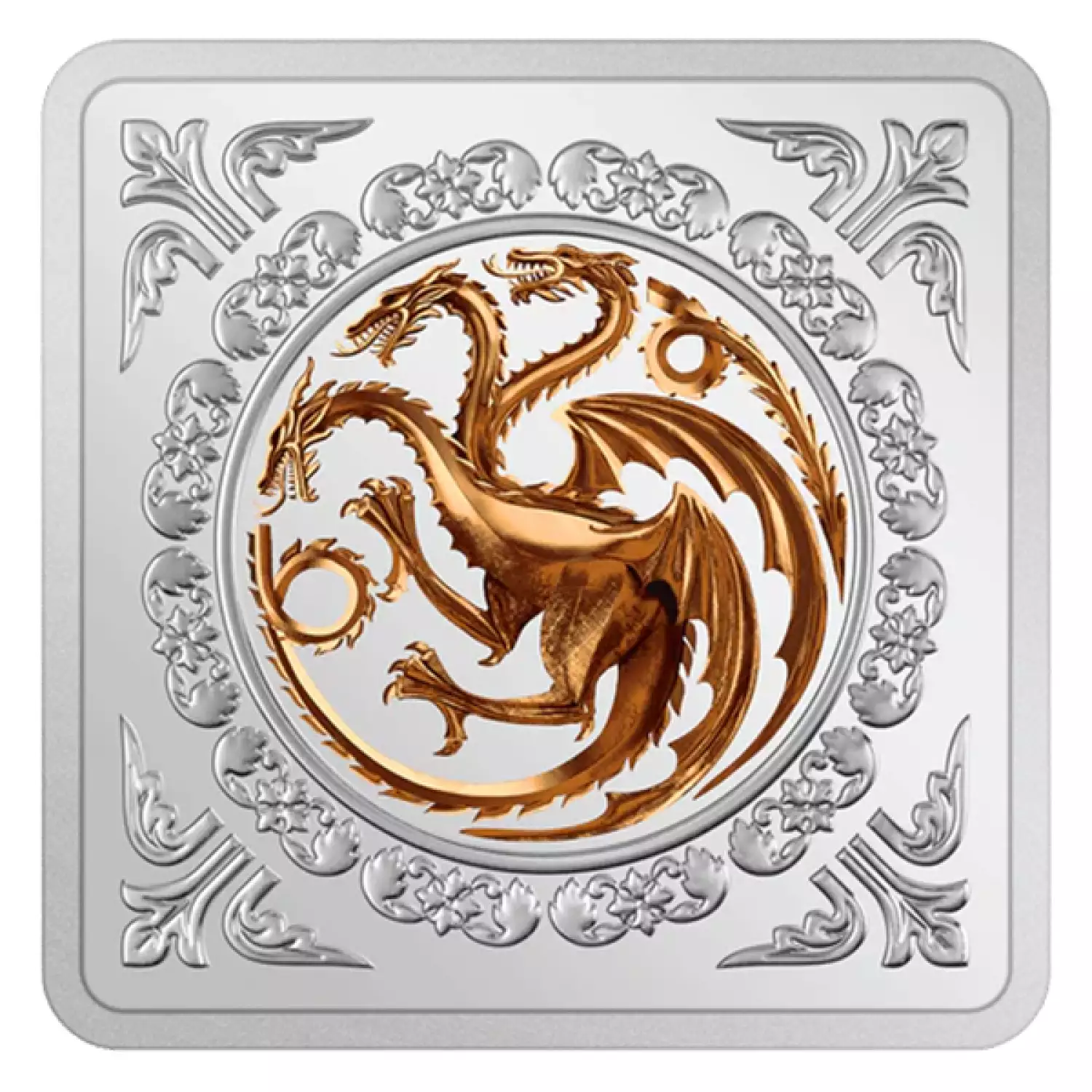 This first collectible for our Game of Thrones™ Collection is a 1oz silver medallion of the Targaryen sigil. Designed as a rectangular badge, one side shows the three-headed red dragon breathing flames on a black background, with the words ‘Targaryen’ engraved below. The other side features the coloured version of the dragons set within an engraved silver border. Also engraved on the medallion is confirmation that it is a full 1oz of .999 fine silver.