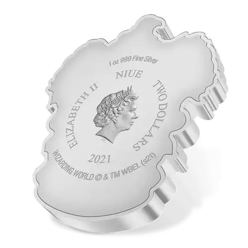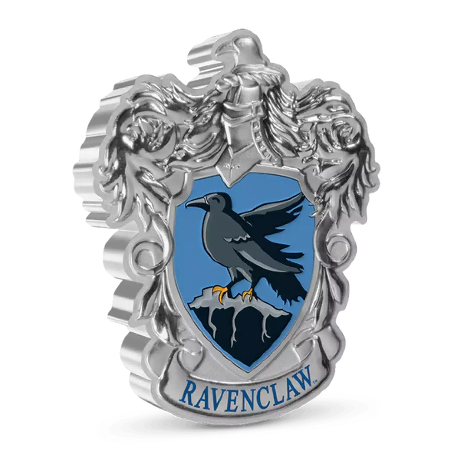 This 1oz pure silver coin is part of the Hogwarts™ House Crest Collection. This shining, silver crest features a raven on a coloured shield. A scroll at the bottom is engraved with the name ‘Ravenclaw’ in blue. The delicately engraved surround has a mirrored and frosted finish for contrast.