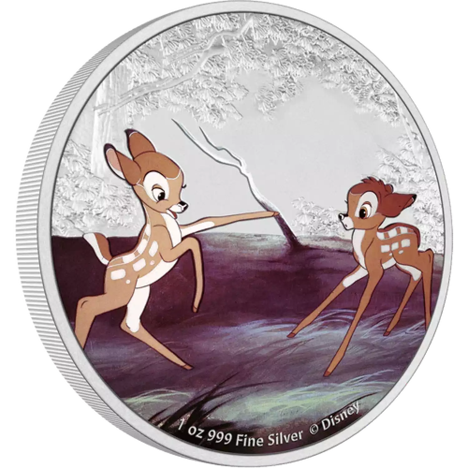 As part of our special Disney’s Bambi 80th anniversary collection, this beautiful coin showcases a coloured image of when Bambi and Faline first meet. You can see the shy Bambi overwhelmed by the bubbly young doe — how adorable!