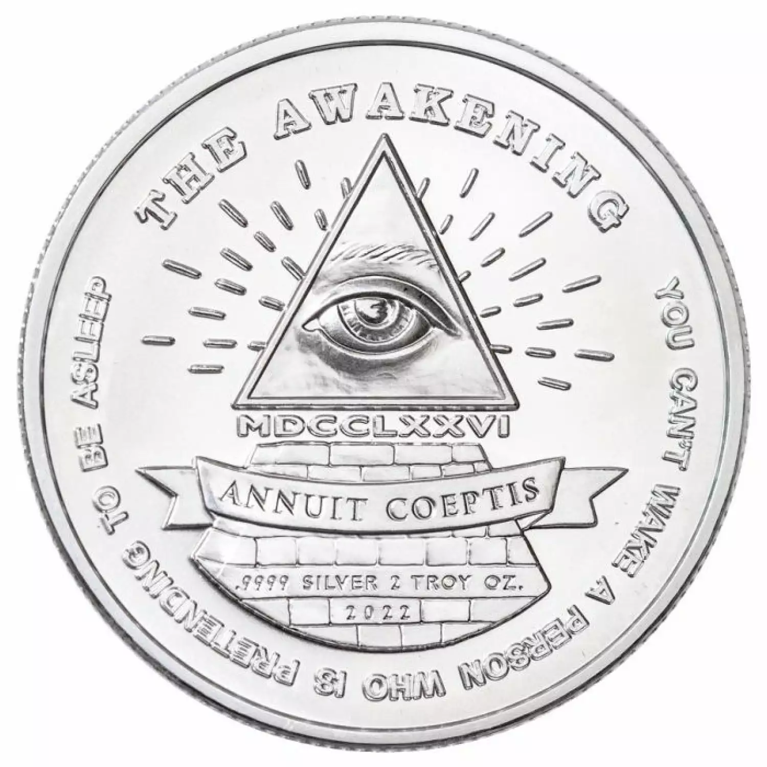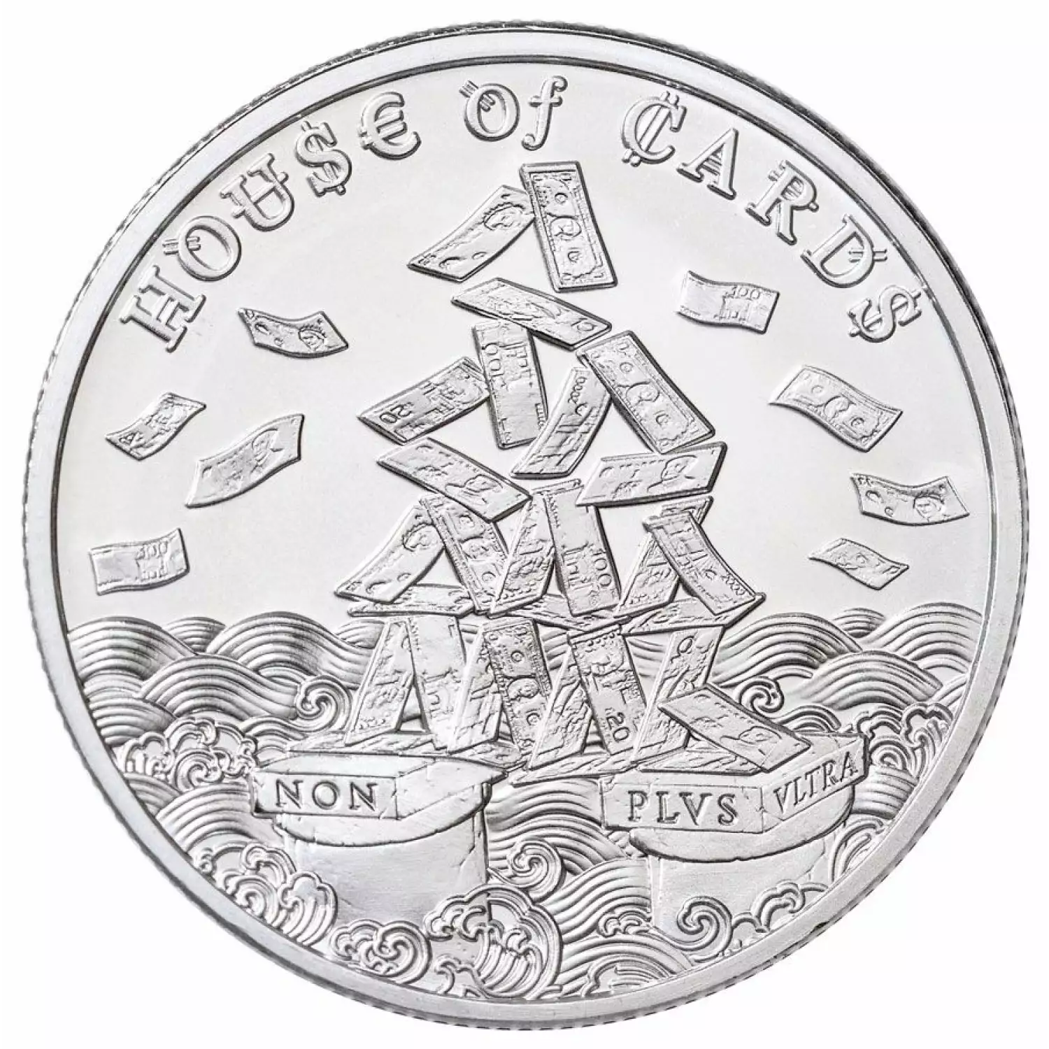 This side of the round displays the House of Cards design. Rough waves fill the background. The cards in this design are actually various pieces of paper currency. The house is perched precariously on top of two pillars that reach just above the waves. Reverse: The reverse of this round shows the common design for the series. The central portion of the design depicts the All-Seeing Eye on top of a pyramid. The date and silver content are inscribed on the lower portion of the pyramid.