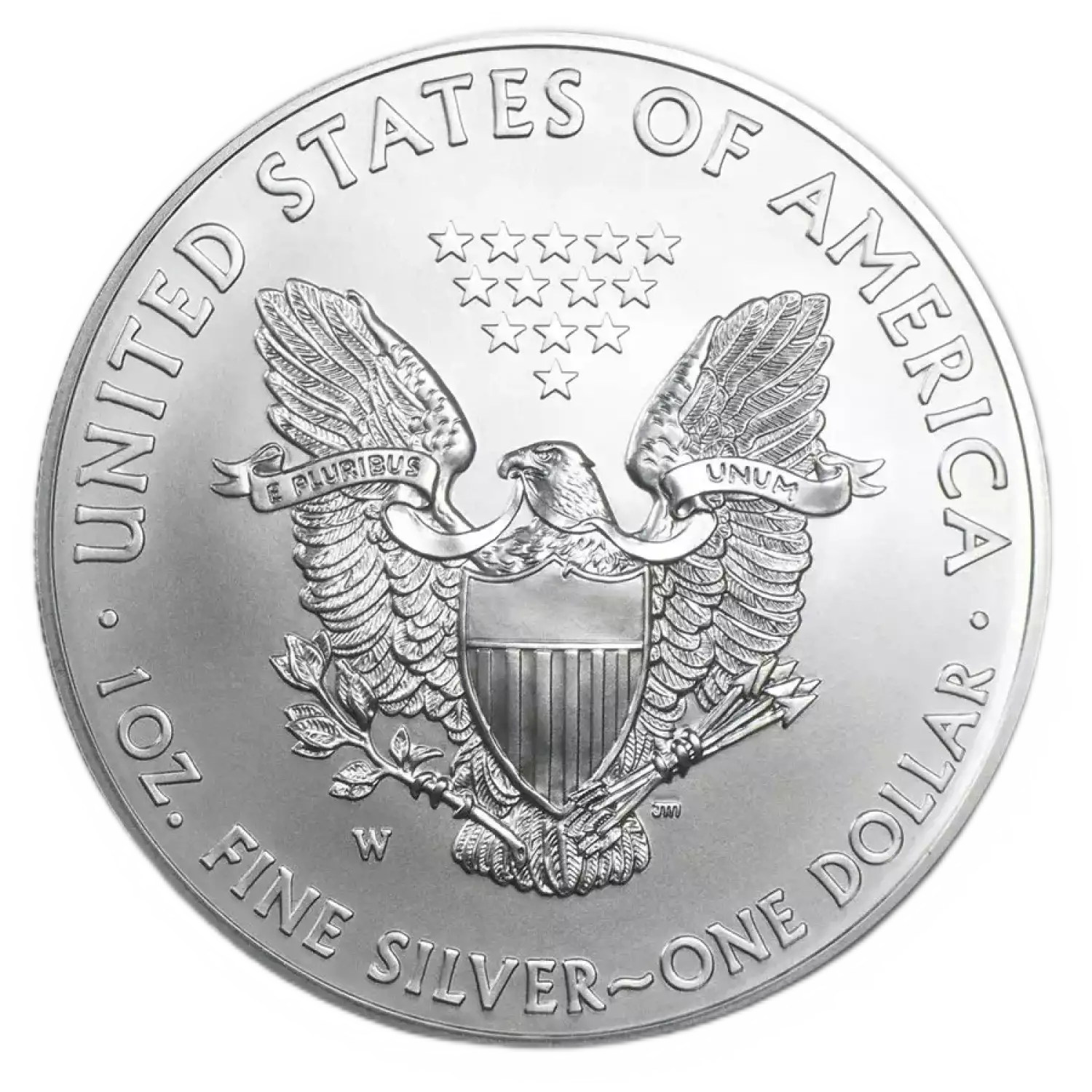 These uncirculated Silver American Eagles bear the "W" mint mark and are struck on specially burnished blanks at the West Point Mint.