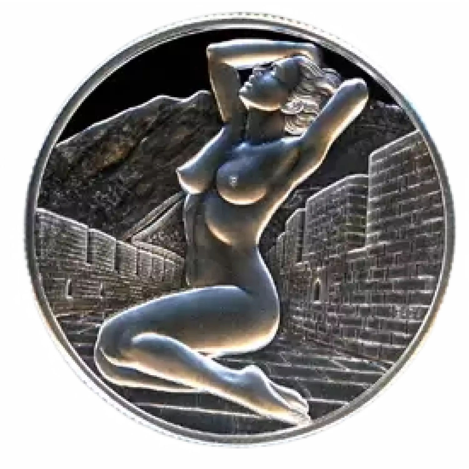On the obverse (front) of this coin/medal the Nude Poser on the Great Wall of China, is reminiscent of the famous Marilyn Monroe calendar pose. A Panda holding her cub is superimposed on a map of China on the reverse. A nonsensical design but extremely well done! This medal weighs one-ounce, is struck in .999 pure silver and measures 39 mm (a bit larger than an old U.S. silver dollar).