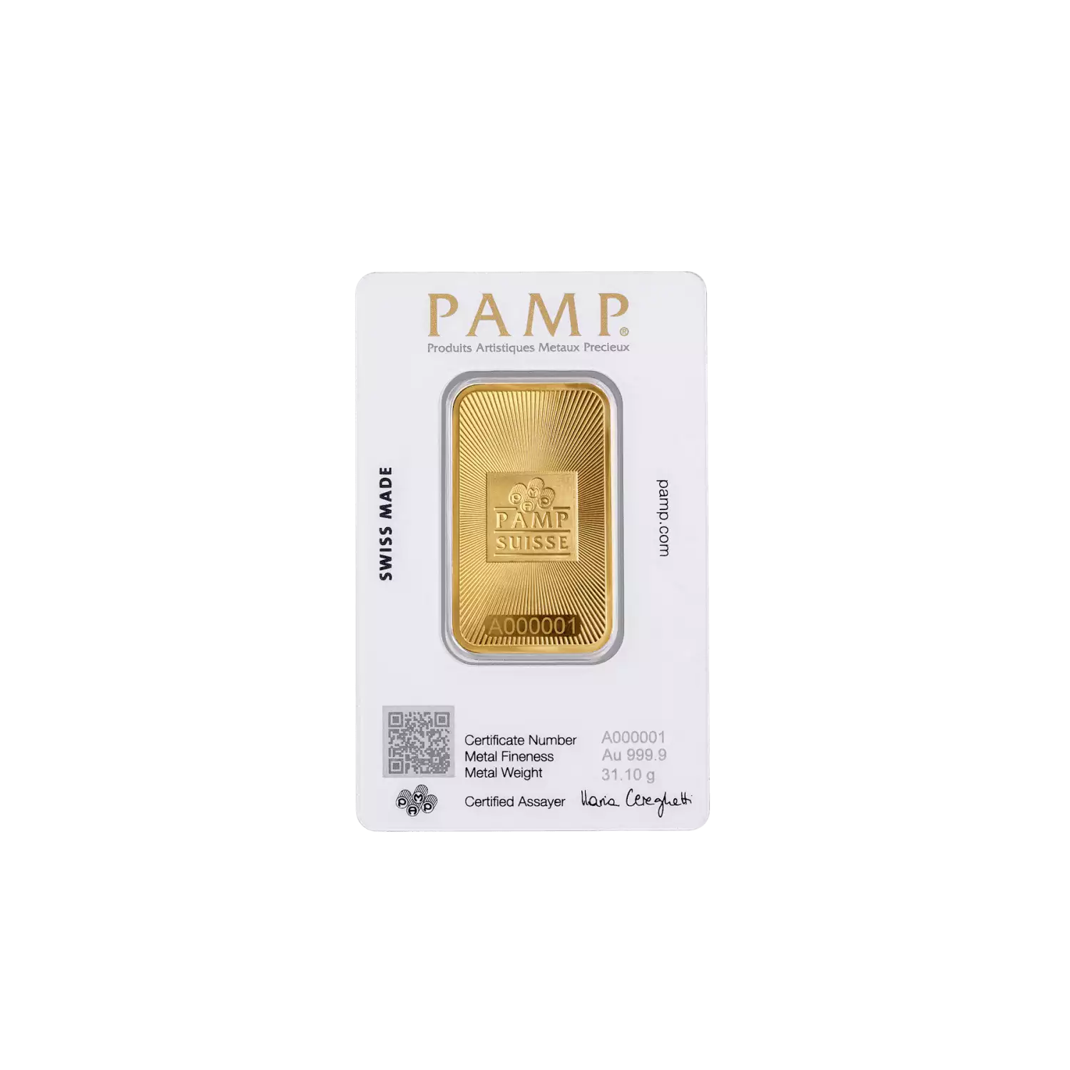 - Weight: The PAMP Suisse 1oz gold bar contains precisely one troy ounce (31.1035 grams) of pure gold. This standard weight is widely recognized and preferred by investors for its ease of trade and liquidity.