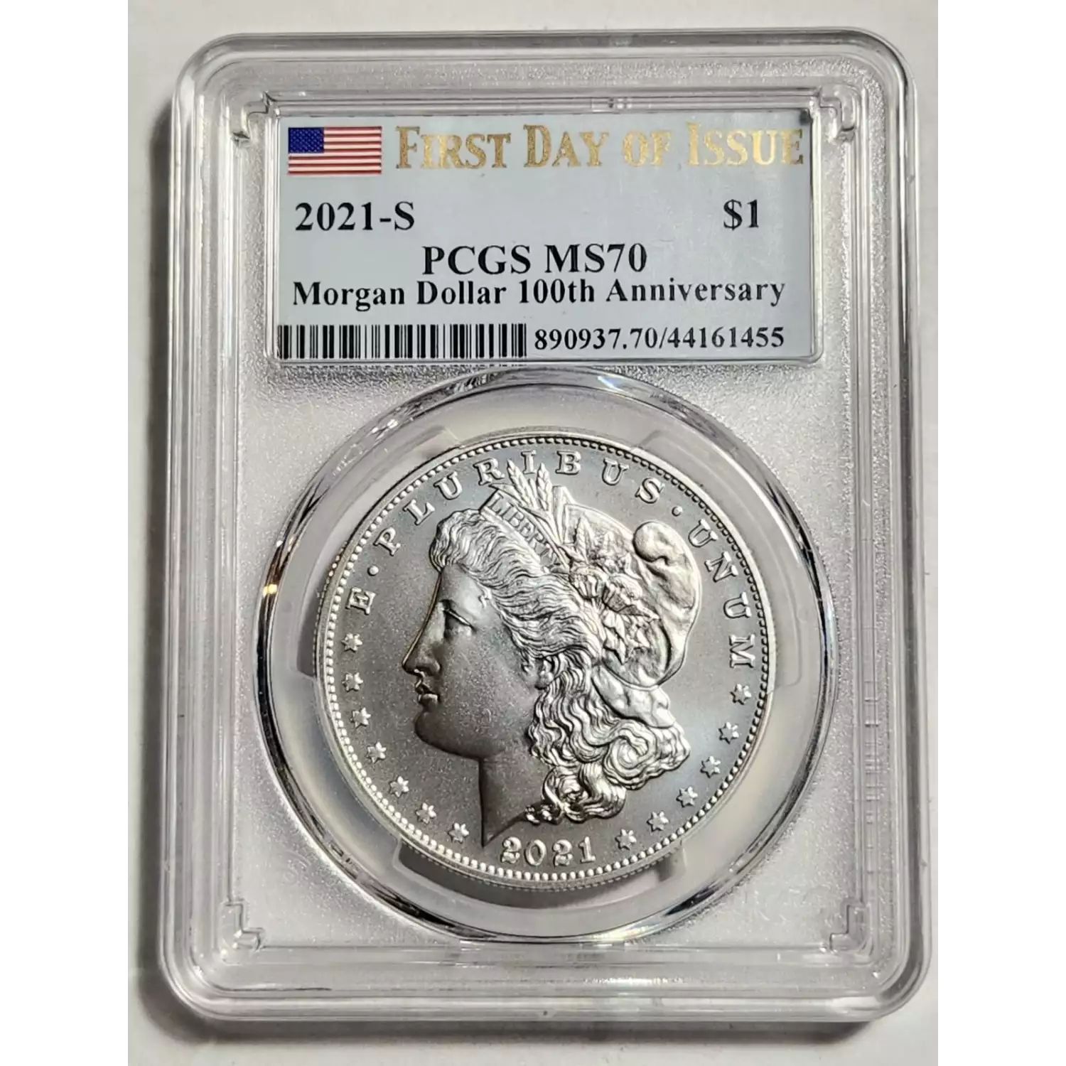 2021-S Morgan Silver Dollar PCGS MS-70 - 100TH ANNIV. - 1ST DAY OF ISSUE - WITH OGP