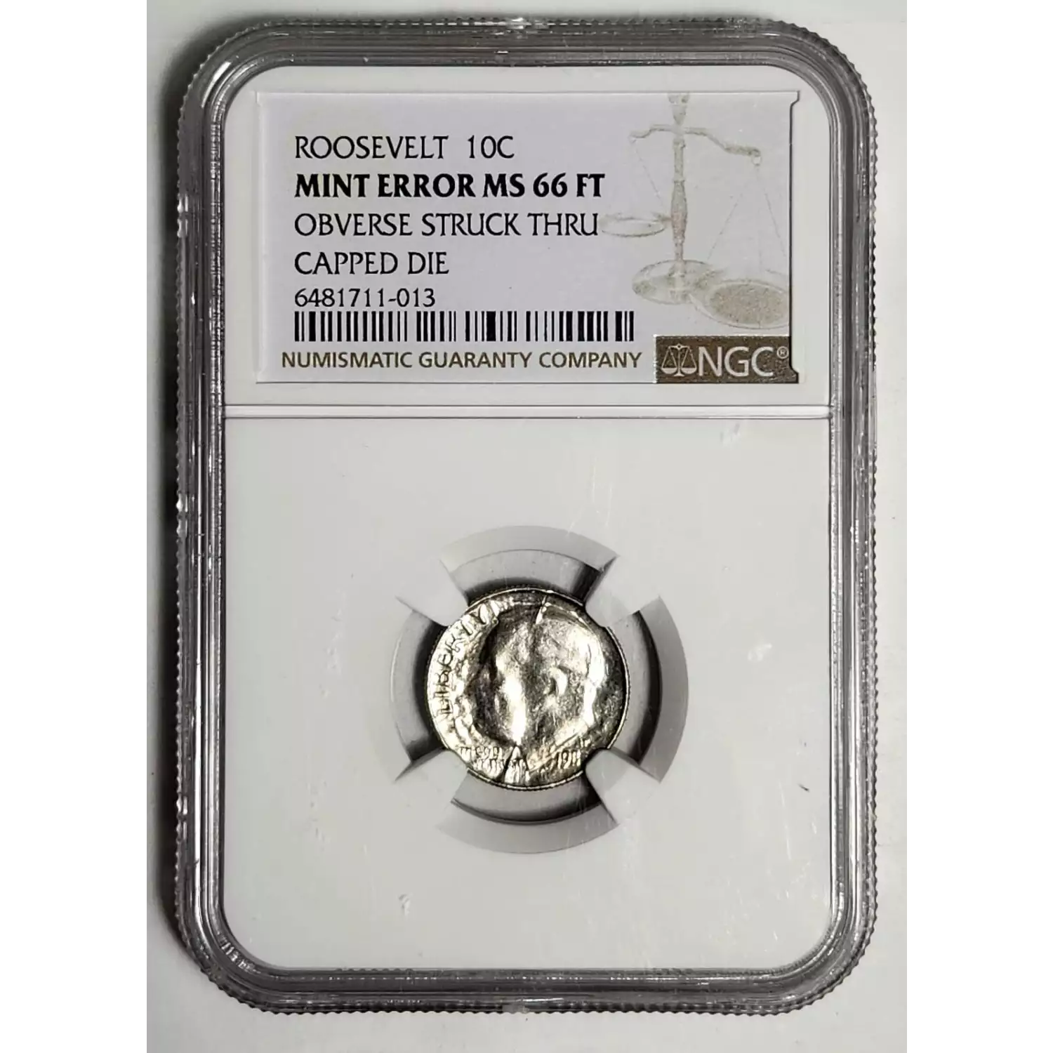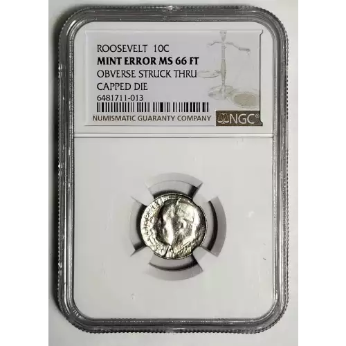 1987 Dimes Roosevelt NGC MS-66 FT - OBVERSE STRUCK THROUGH - CAPPED DIE