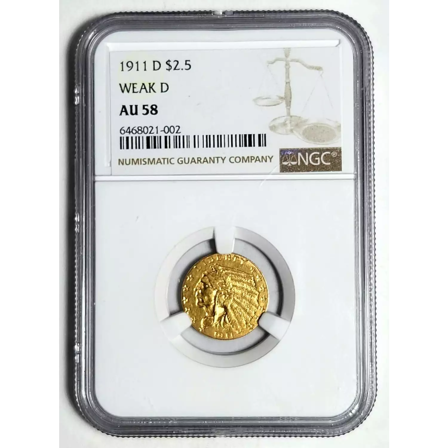 1911 Gold Quarter Eagles $2 1/2 Indian Head NGC AU-58 WEAK D