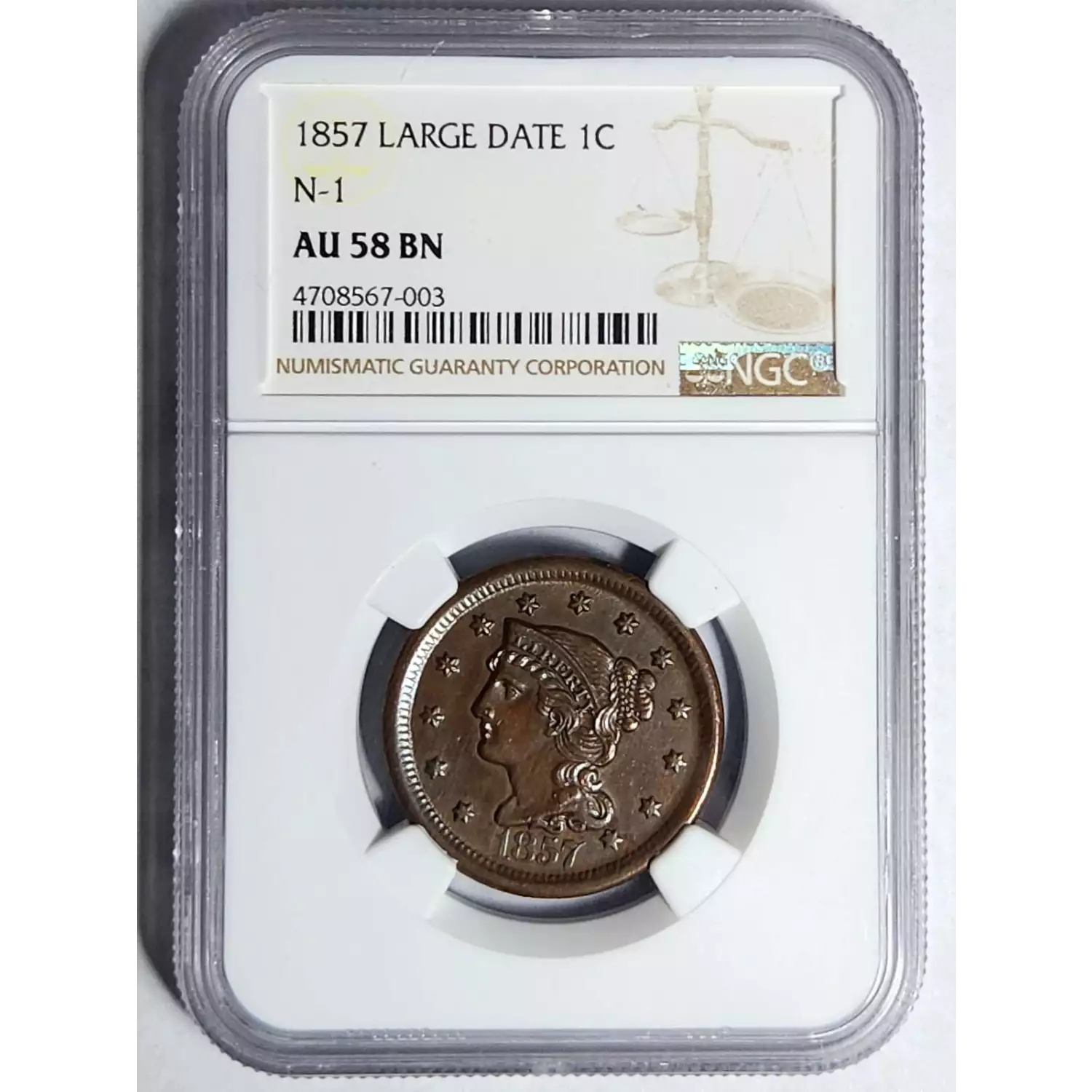 1857 Braided Hair Cent NGC AU-58 BN N-1 - LARGE DATE