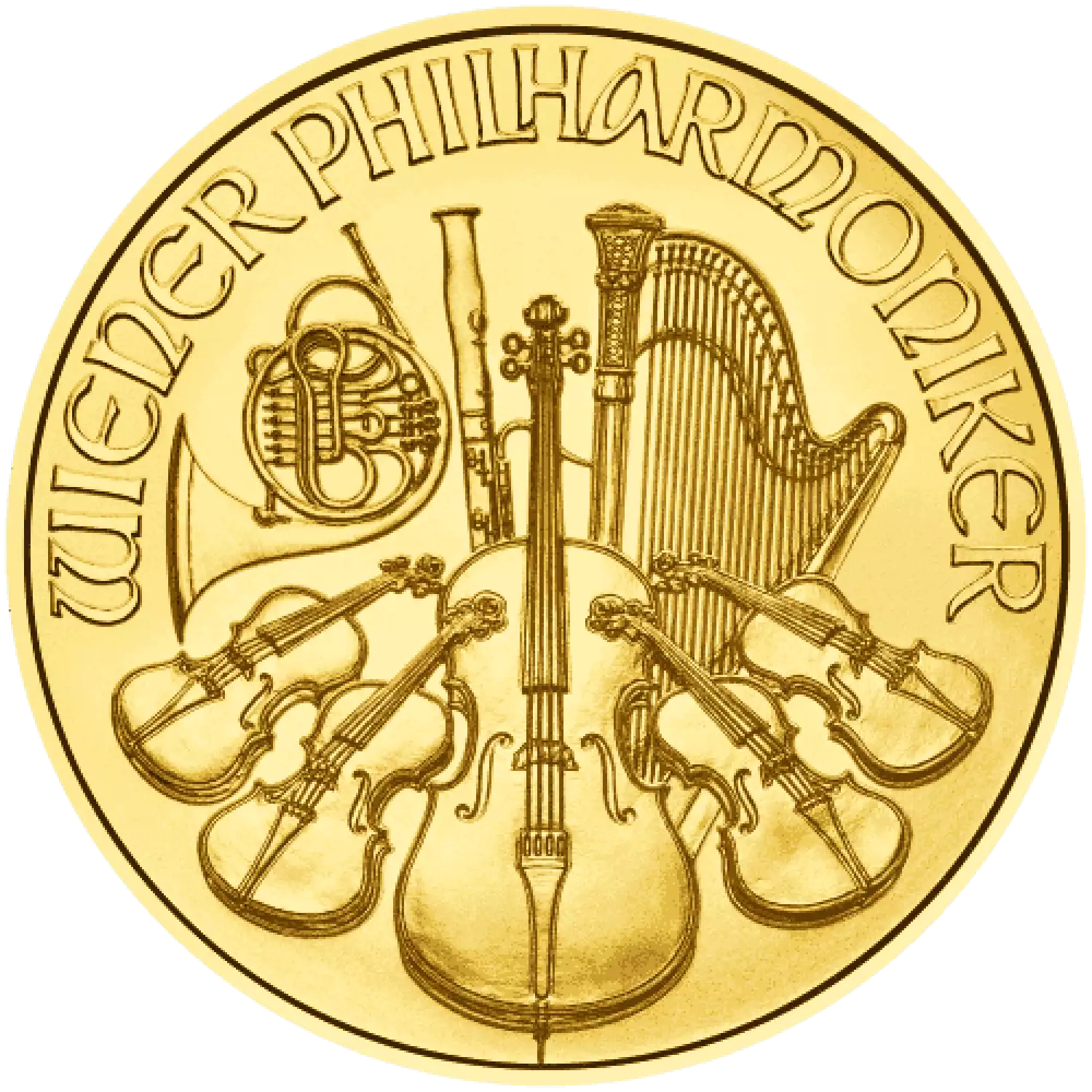- The obverse side features a depiction of "The Golden Hall," the Musikverein, which is the home of the Austrian Philharmonic. It also displays the coin's country and year of issue, legal tender value, metal weight, and purity.