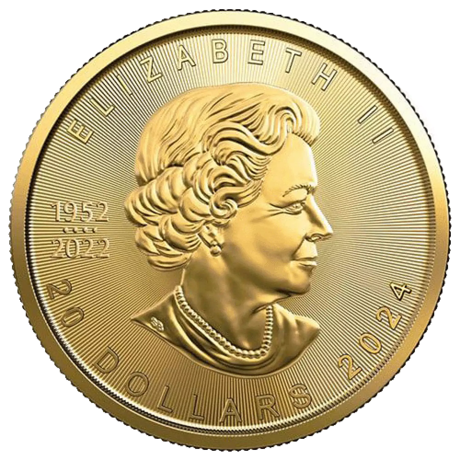 The 2024 1/2 oz Canadian Gold Maple Leaf is one of the most popular gold coins in the world. These beautiful gold coins are backed by the Canadian government and contain a gold purity of .9999.The obverse features the effigy of Queen Elizabeth II by Susanna Blunt The obverse also bears a special marking that includes four pearls symbolizing the four effigies that have graced Canadian coins and the double date of her reign. Three unique features for cutting edge security, including precise radial lines, a micro engraved leaf and Bullion DNA TM Anti Counterfeiting Technology, exclusive to the Royal Canadian Mint. Bullion DNA TM technology facilitates the authentication of Gold Maple Leaf coins dated 2014 and later. An attractive acquisition for both first time precious metal buyers and long term investors. Precision cut radial lines create a unique light diffracting pattern specific to this coin