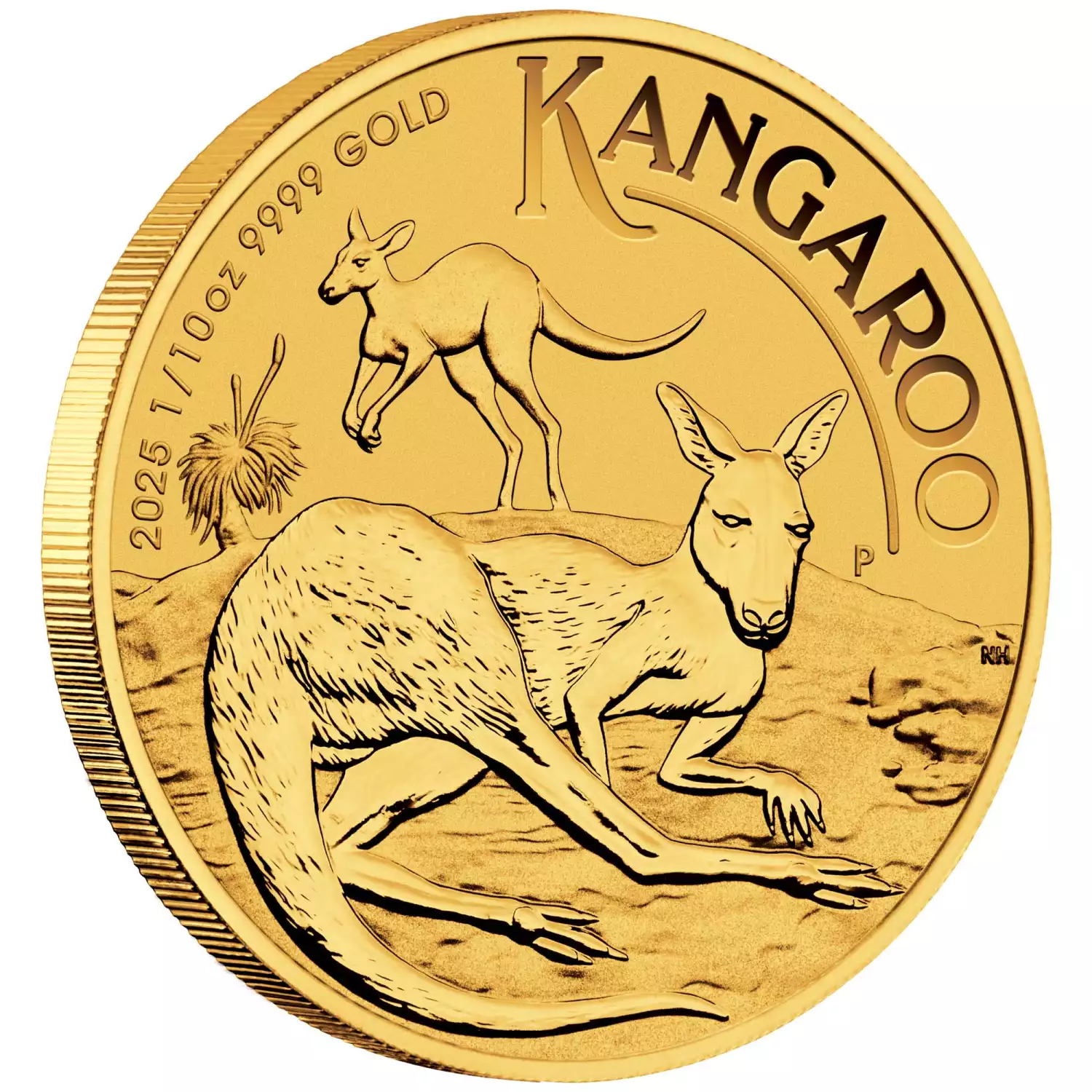 At the heart of this striking coin is the majestic kangaroo, which has become an instantly recognizable symbol of Australian culture. The 2025 design showcases the kangaroo in impressive detail, with intricate textures and shading that bring the coin to life. The reverse side of the coin also features the inscriptions "KANGAROO", "2025 1/10oz 9999 Au", and the Perth Mint's traditional "P" mintmark.