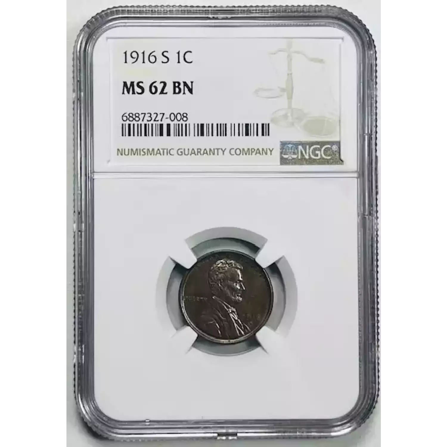 1916-S Small Cents Lincoln, Wheat Ears Reverse NGC MS-62 BN
