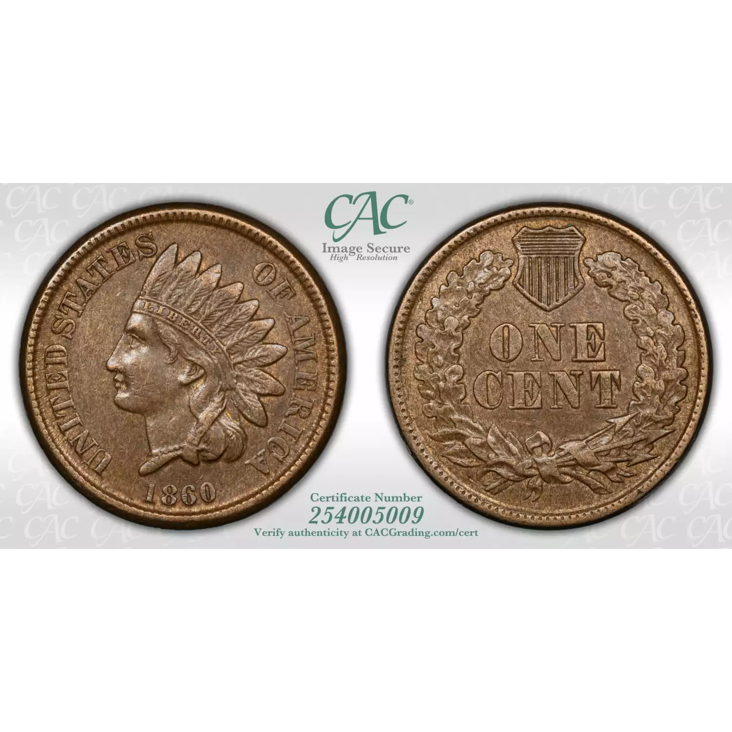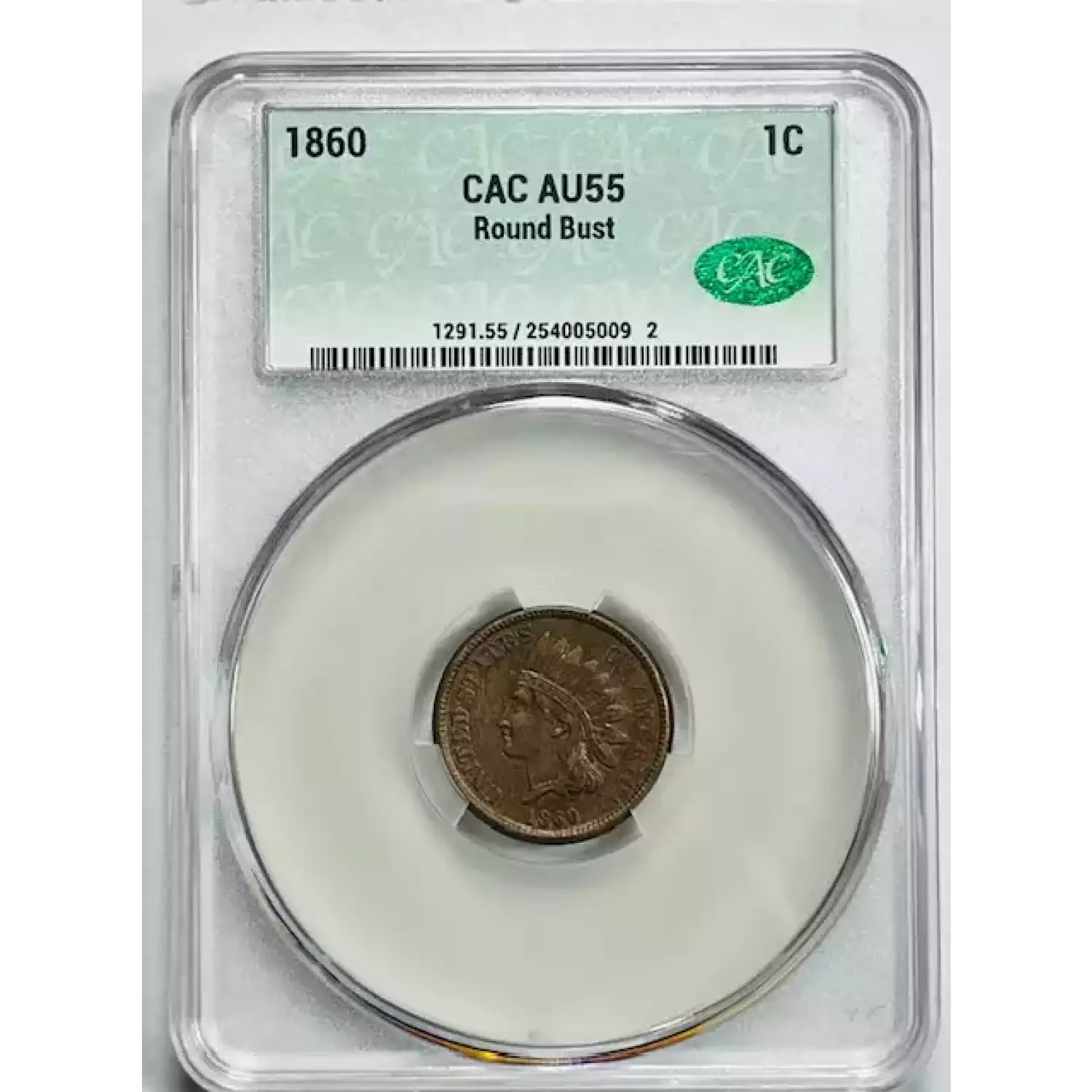 1860 Small Cents Indian Head CACG AU 55 Round Bust CAC
