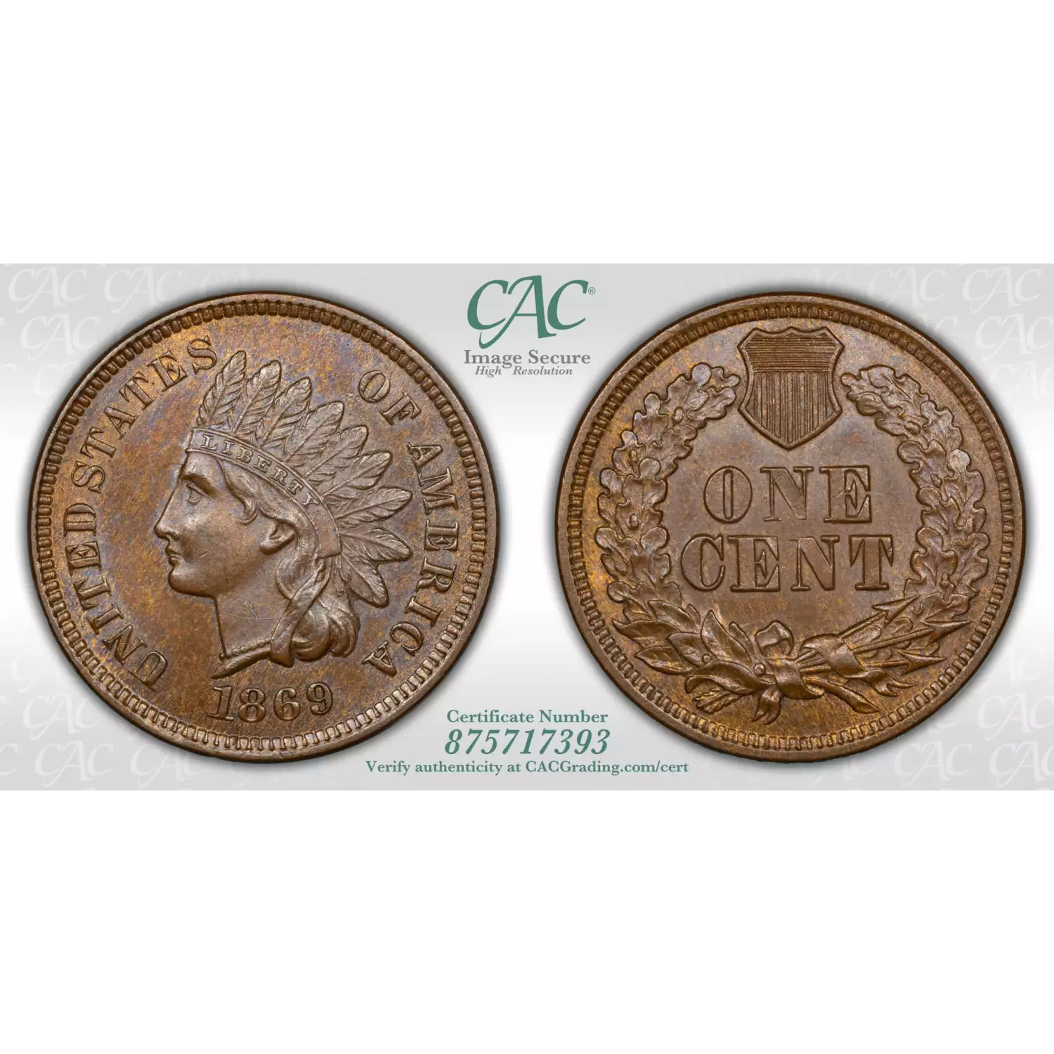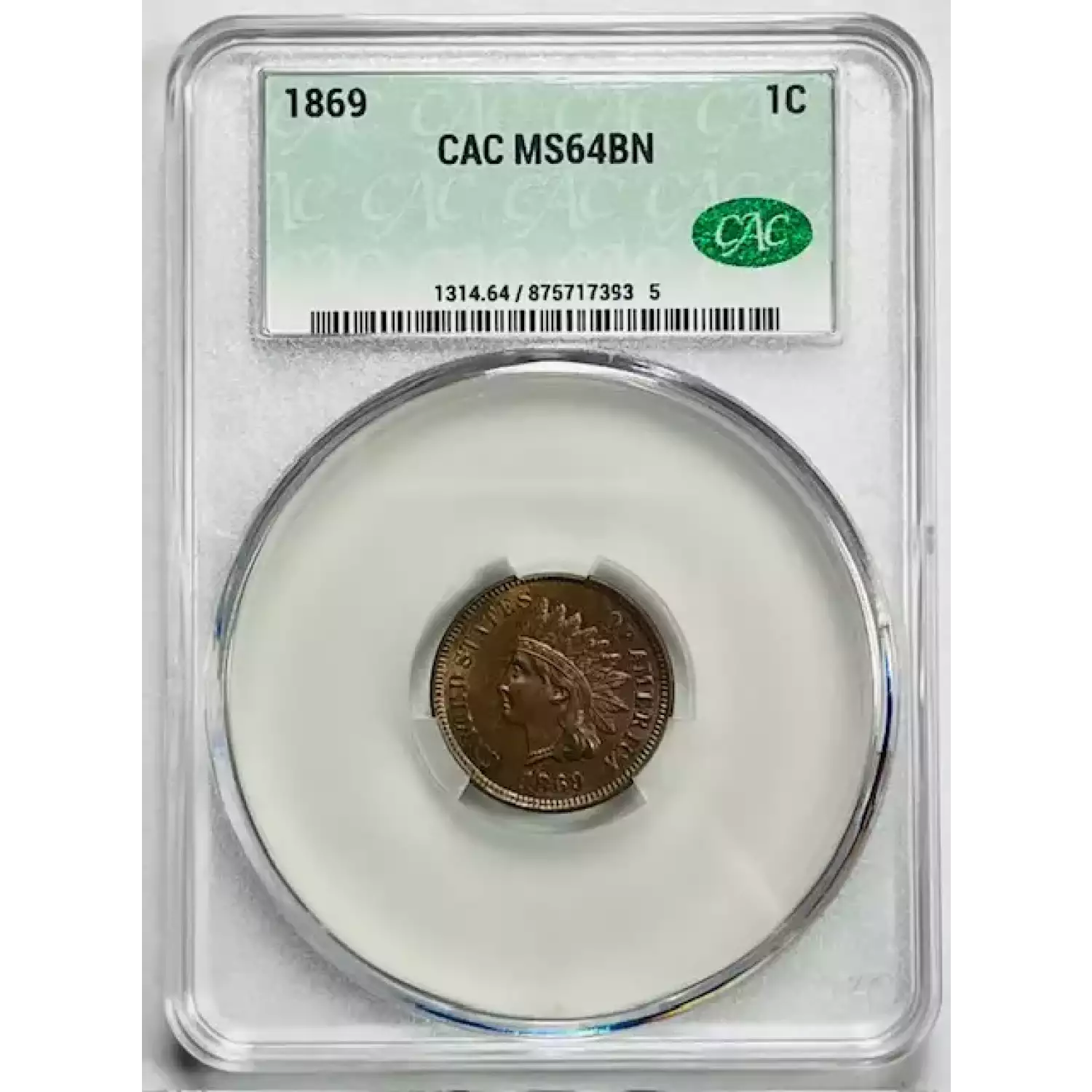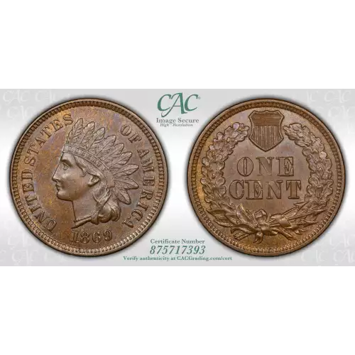 1869 Small Cents Indian Head CACG MS 64 BN CAC