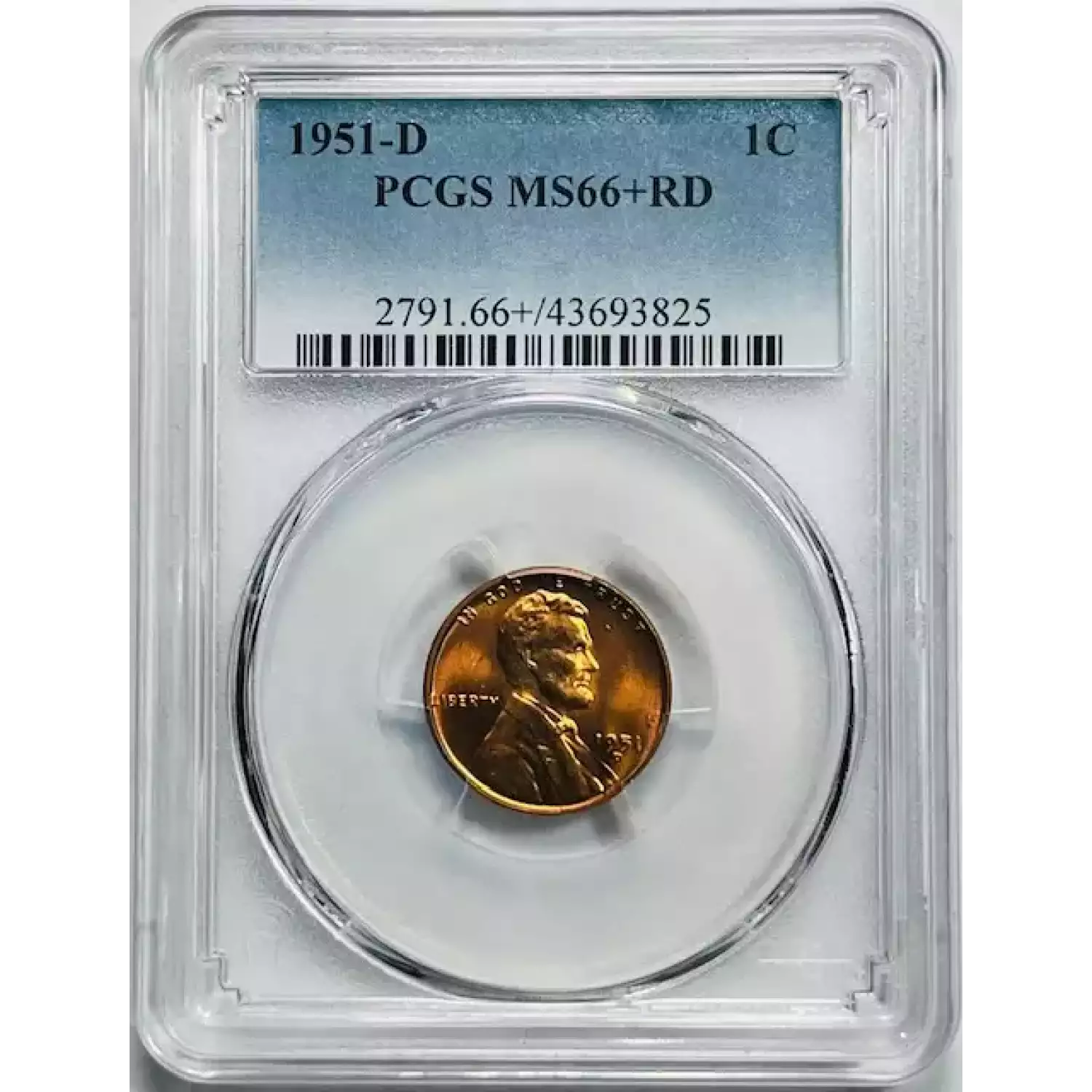1951-D Small Cents Lincoln, Wheat Ears Reverse PCGS MS-66+ RD