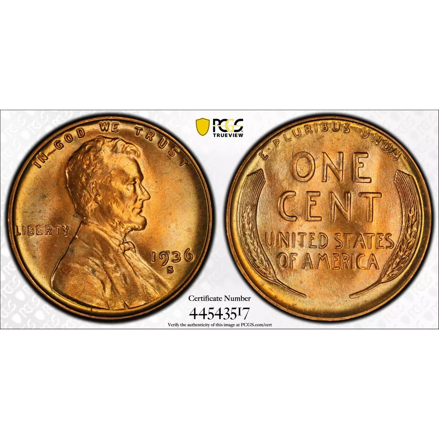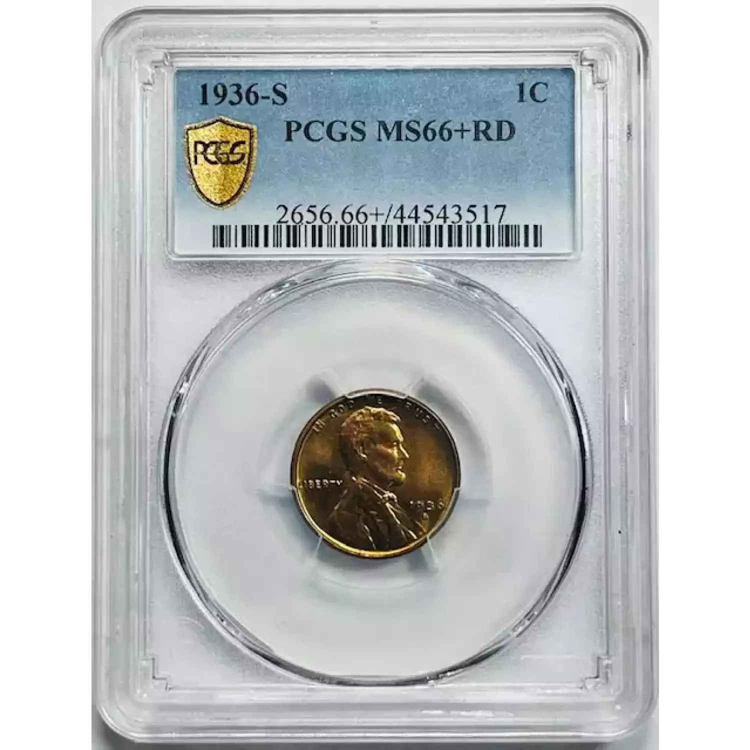 1936-S Small Cents Lincoln, Wheat Ears Reverse PCGS MS-66+ RD