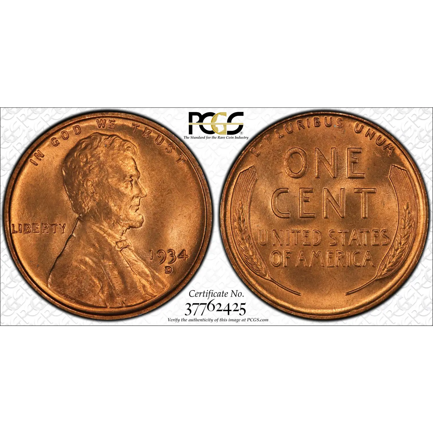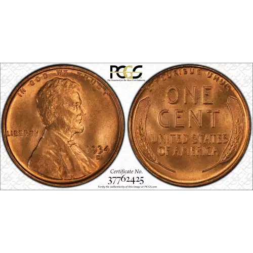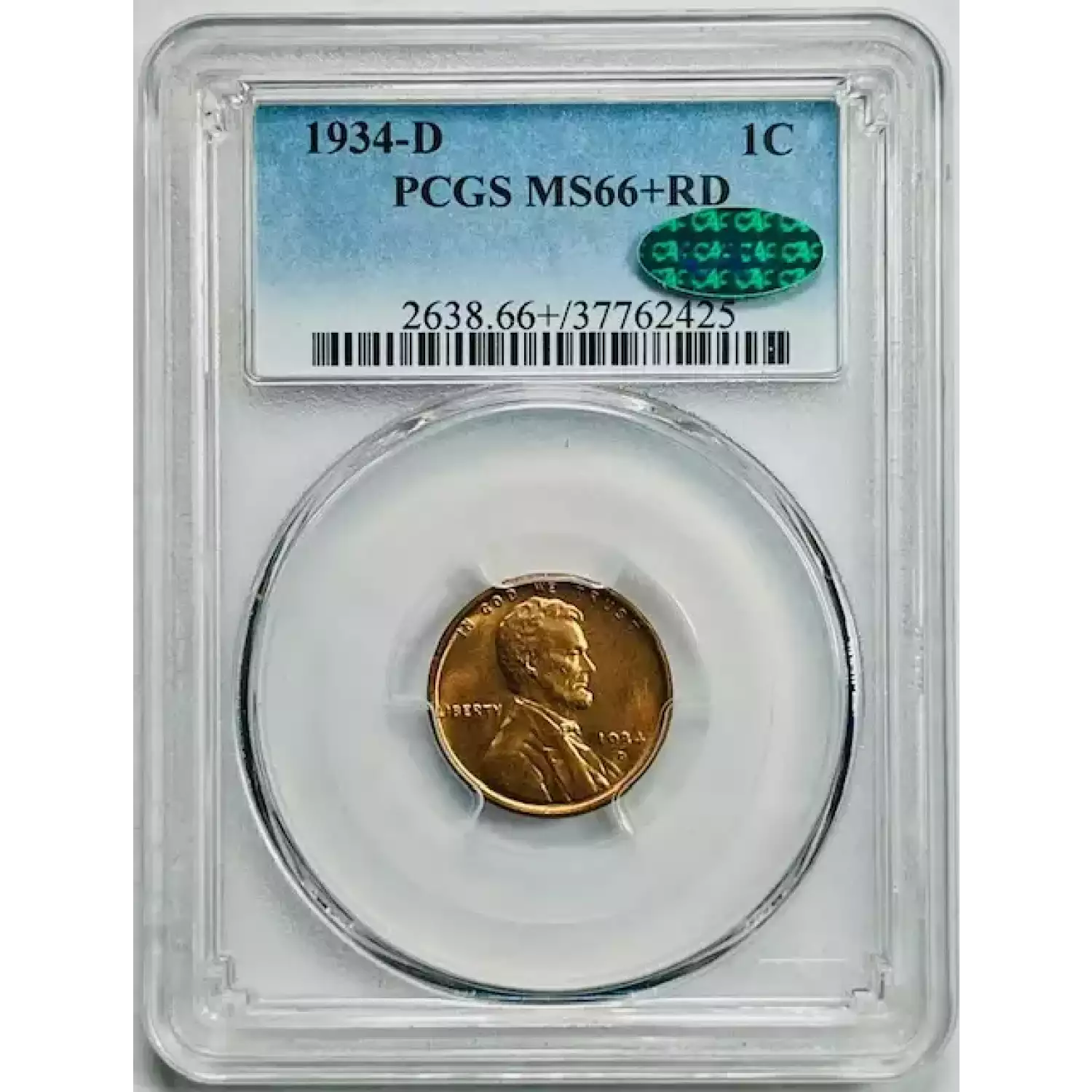 1934-D Small Cents Lincoln, Wheat Ears Reverse PCGS MS-66+ RD CAC