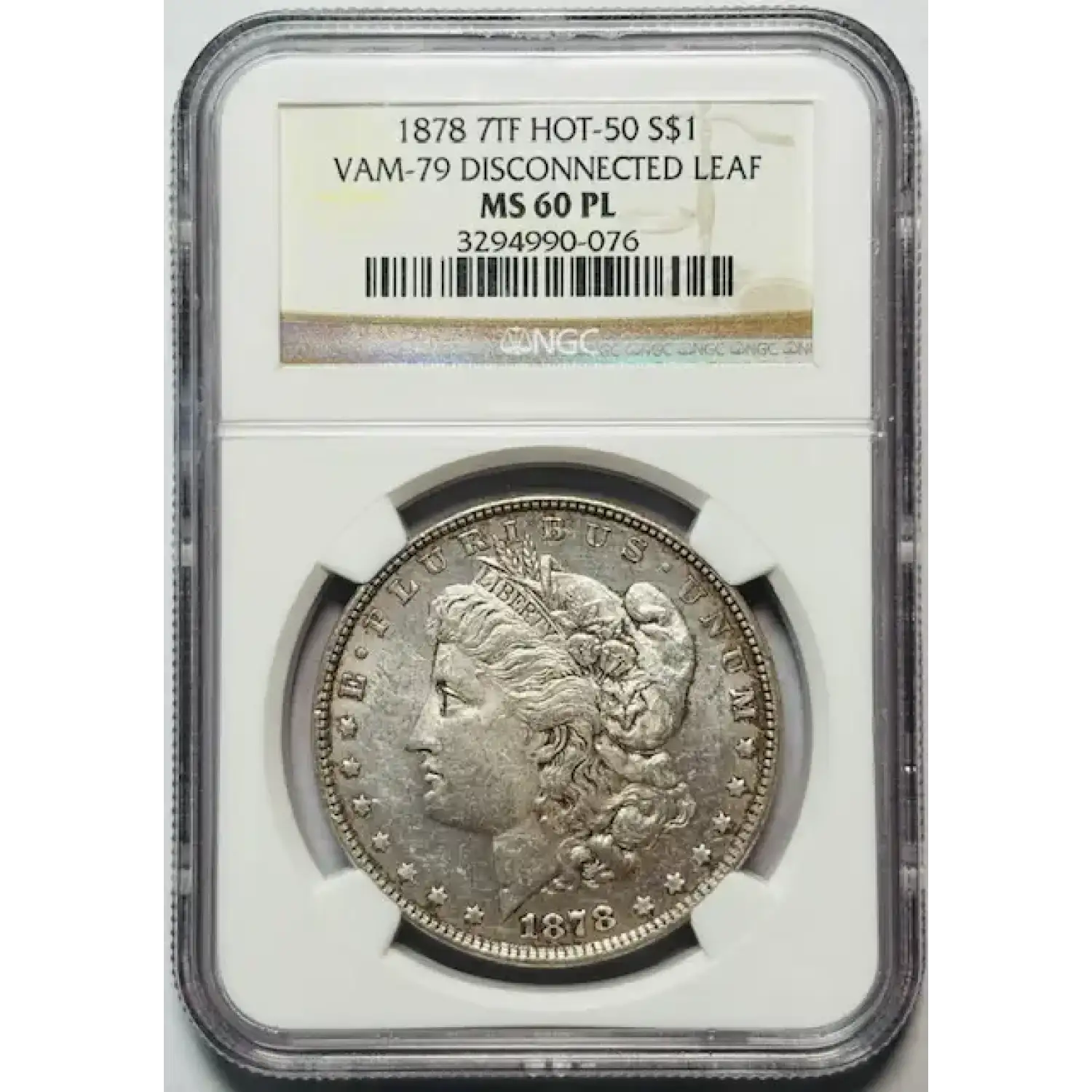 1878 Morgan Silver Dollar NGC MS-60 PL VAM-79 Disconnected leaf