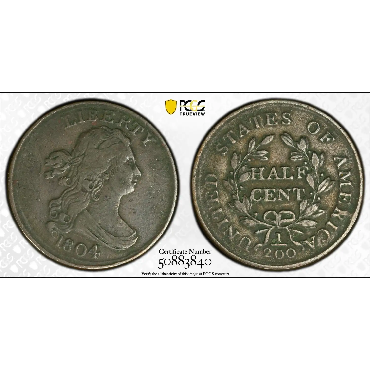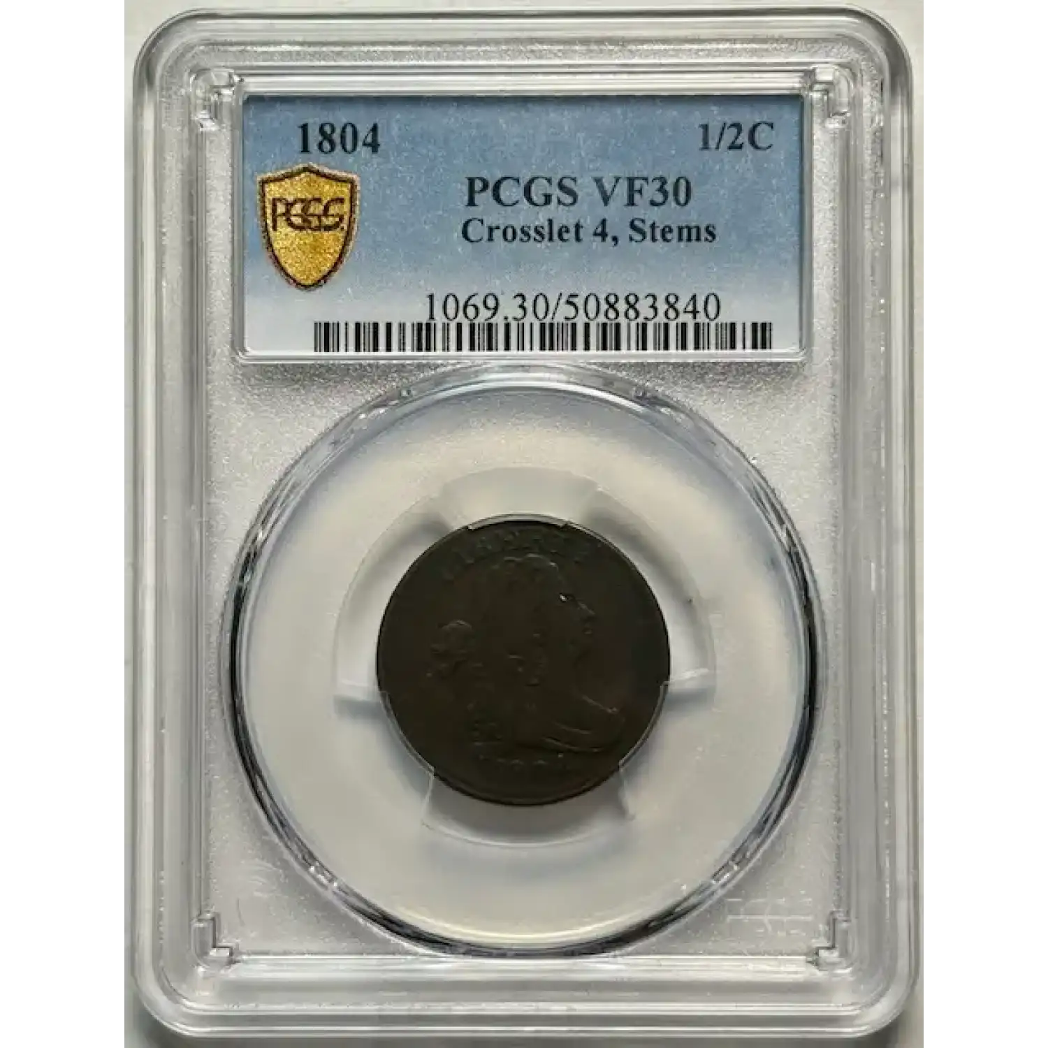 1804 Half Cents Draped Bust 1800 - 08 Copper PCGS VF-30 BN Crosslet 4, Stems