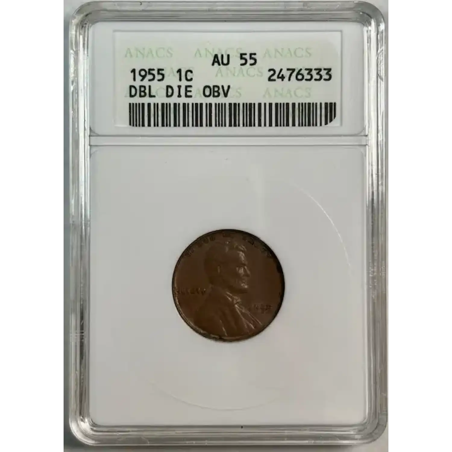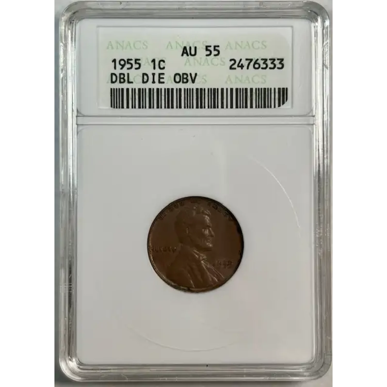1955 Small Cents Lincoln, Wheat Ears Reverse ANACS AU-55 Double Die Obv