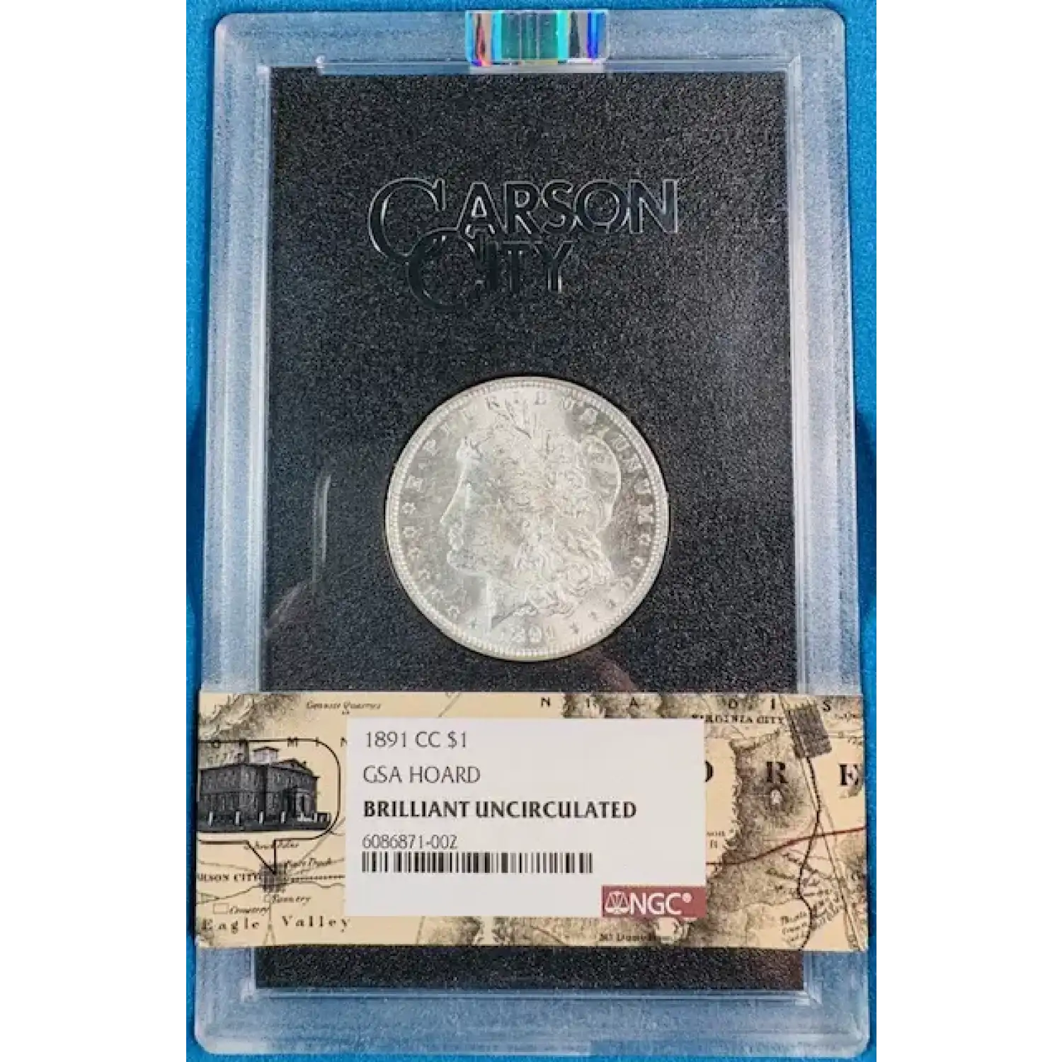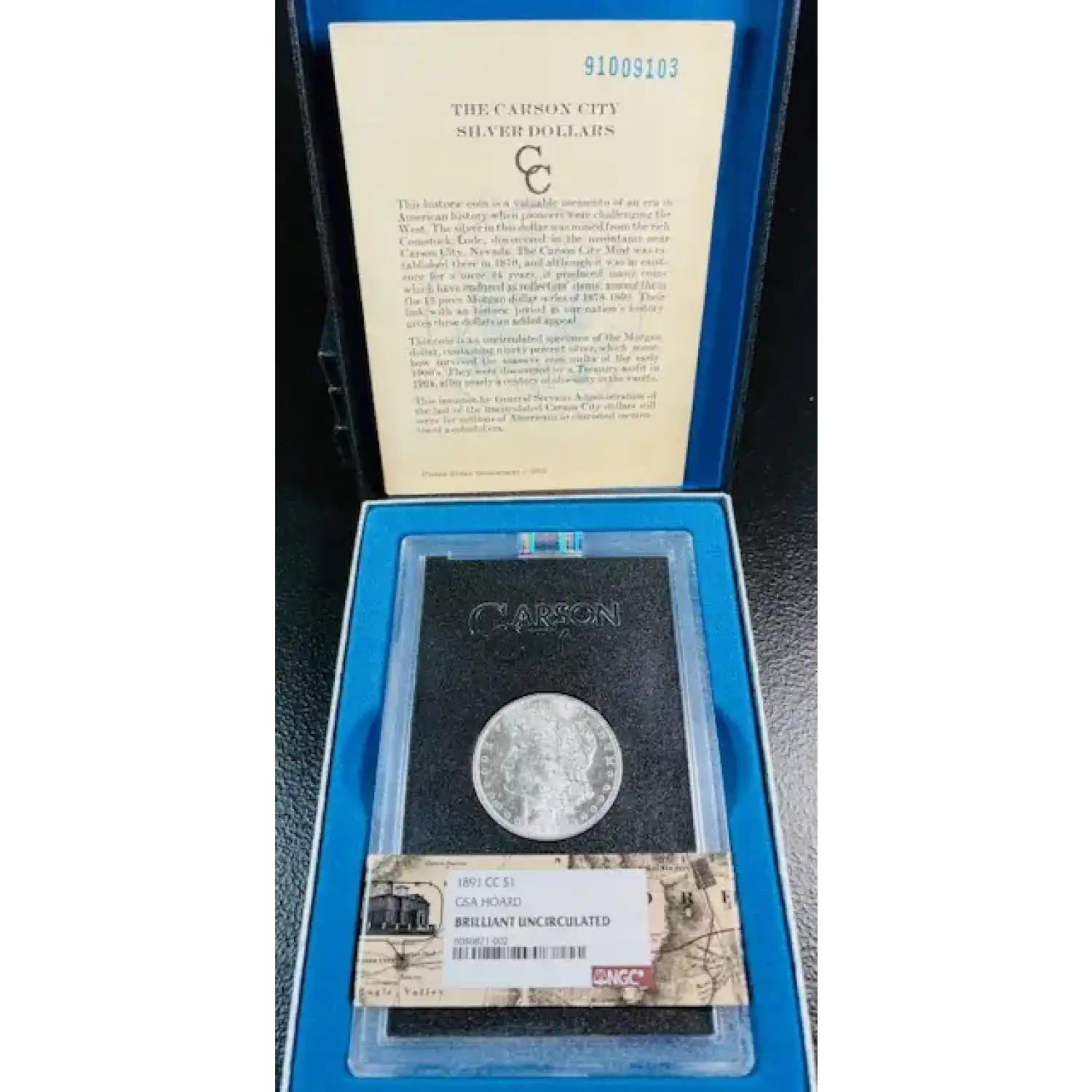 1891-CC Morgan Silver Dollar NGC Uncirculated GSA HOARD OGP/COA