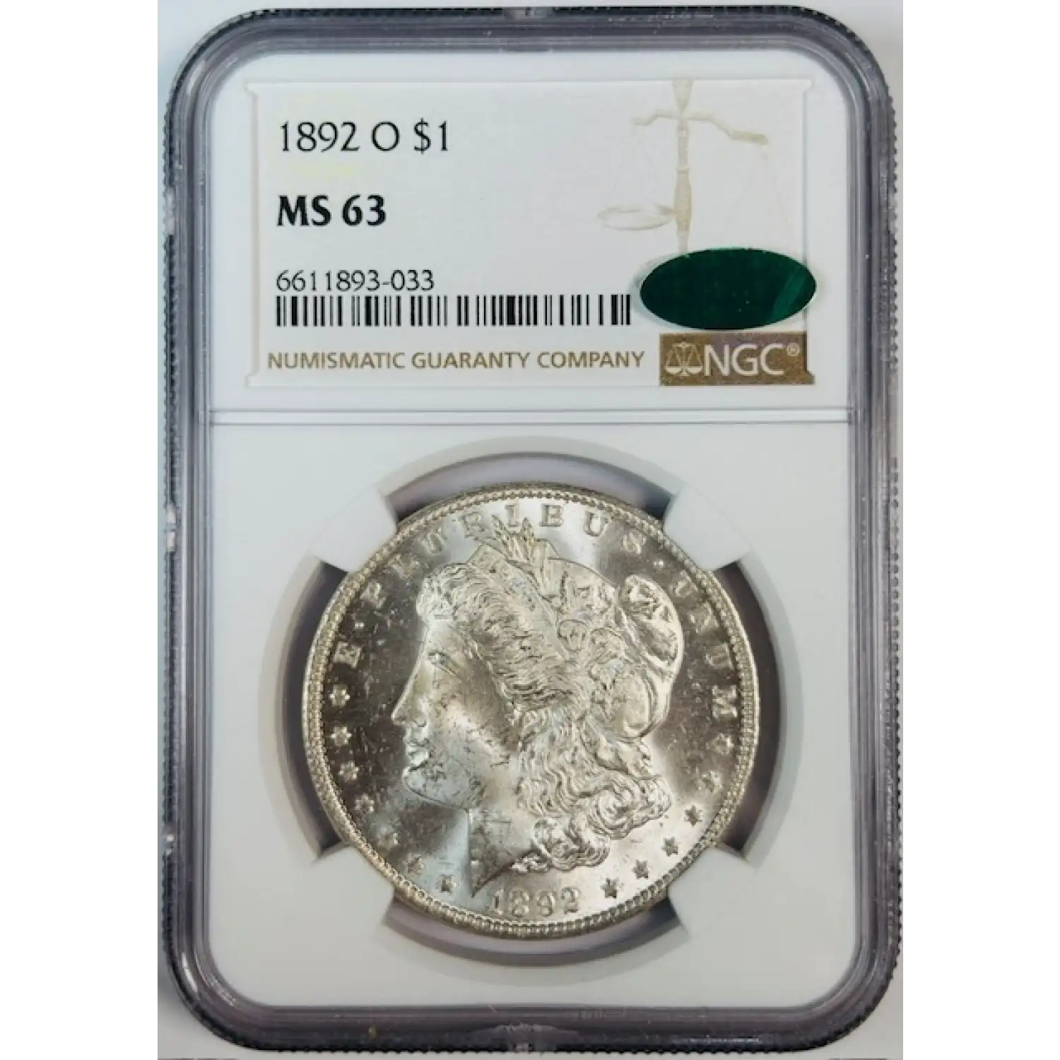 1892-O Morgan Silver Dollar NGC MS-63 Low CAC Pop! CAC