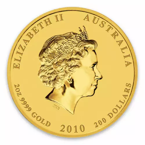 The 2010 2 oz Australian Perth Mint Gold Lunar II: Year of the Tiger contains 2 oz of .9999 actual gold. The Obverse of the coin features the Ian Rank-Broadley likeness of Her Majesty Queen Elizabeth II. The Reverse displays a tiger’s head and the Chinese character for "tiger" with the Perth Mint’s traditional “P” mintmark.
